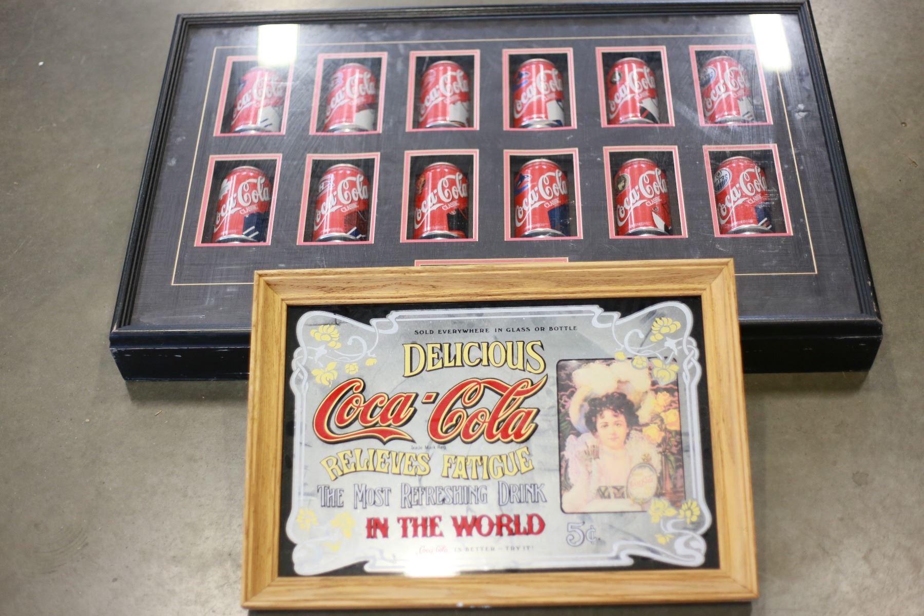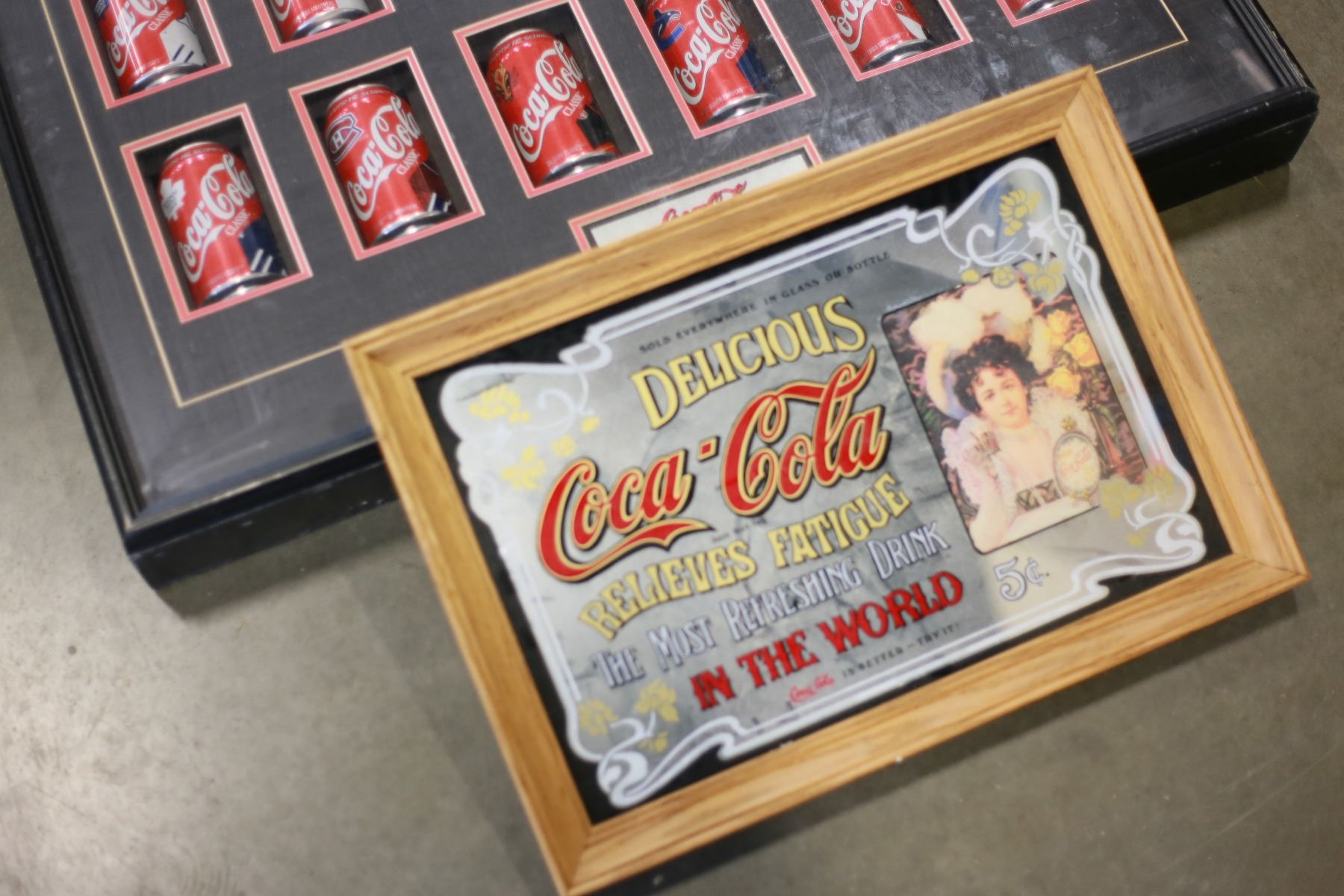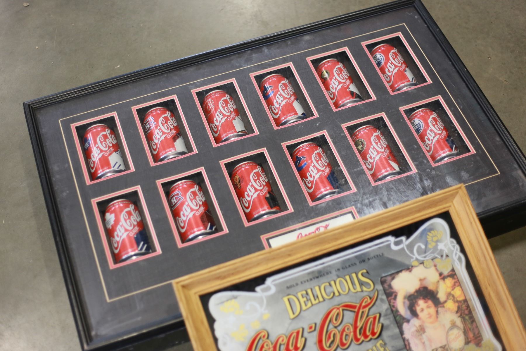 LARGE COCA COLA FRAMED MIRROR AND FRAMED SHADOW BOX NHL COCA COLA TINS