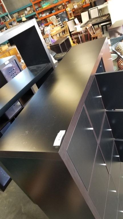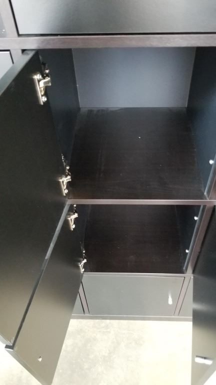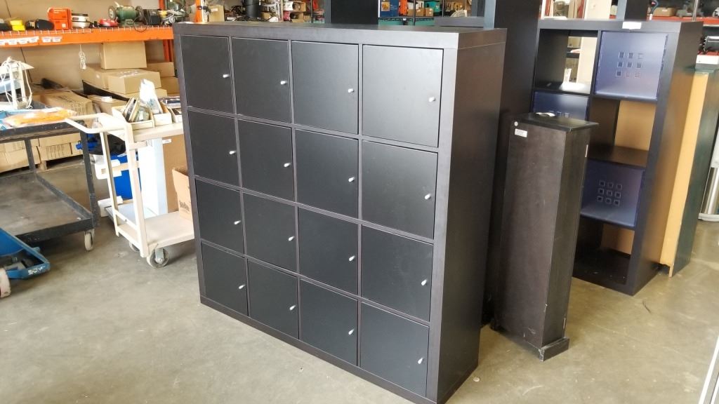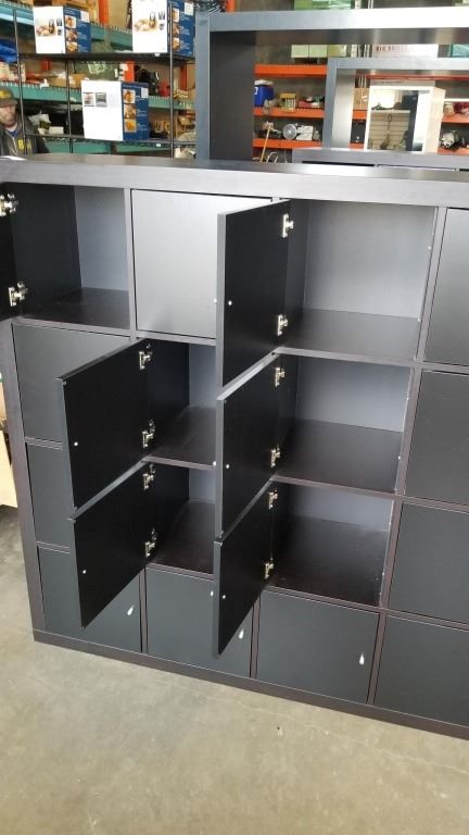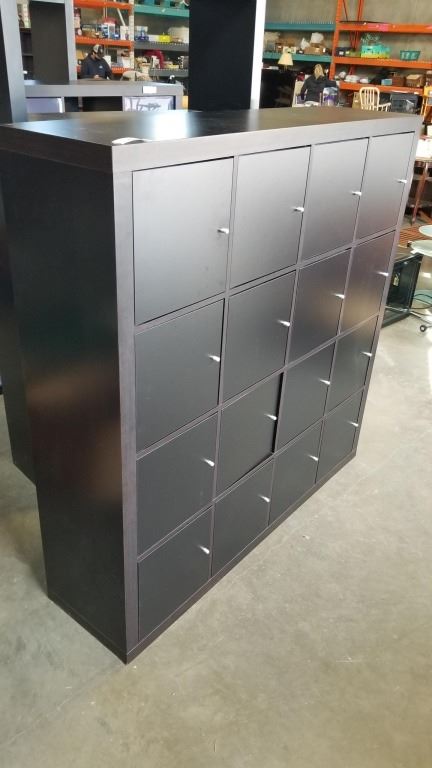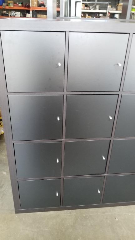 LARGE CUBICAL SHELF WITH 16 DOORS - 59 INCHES TALL X 59 1/2 INCHES WIDE X 15 1/2 INCHES DEEP