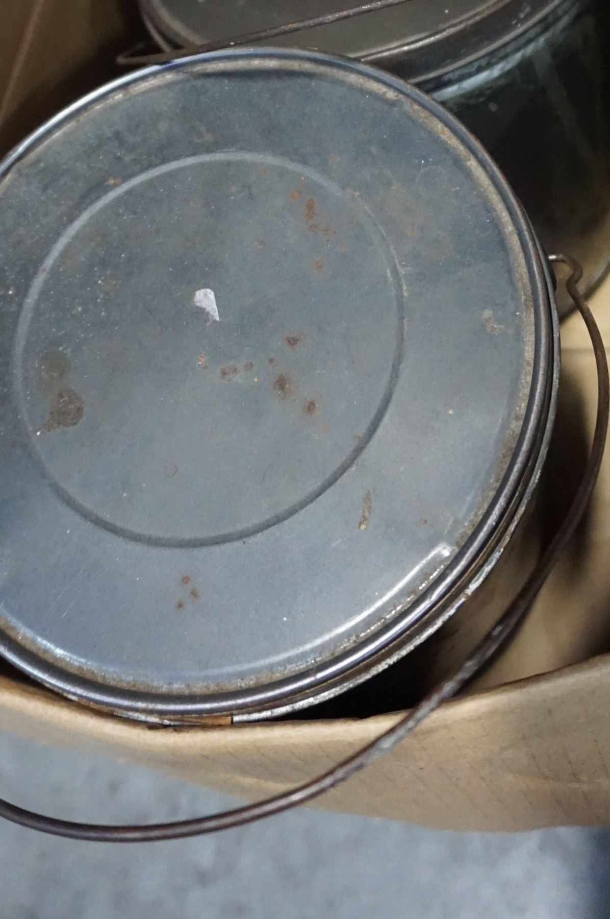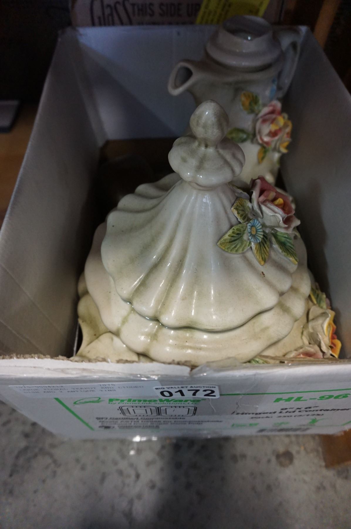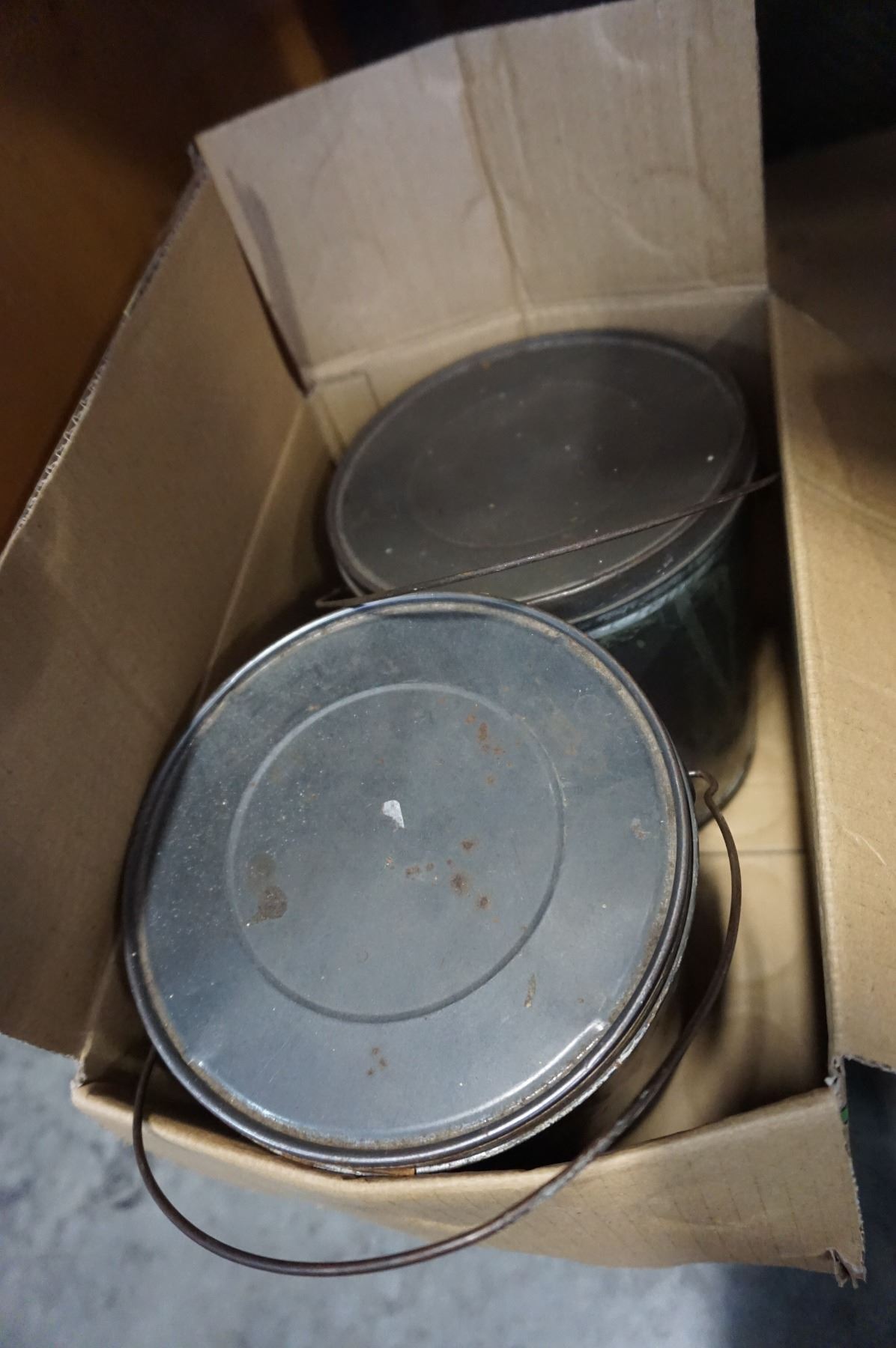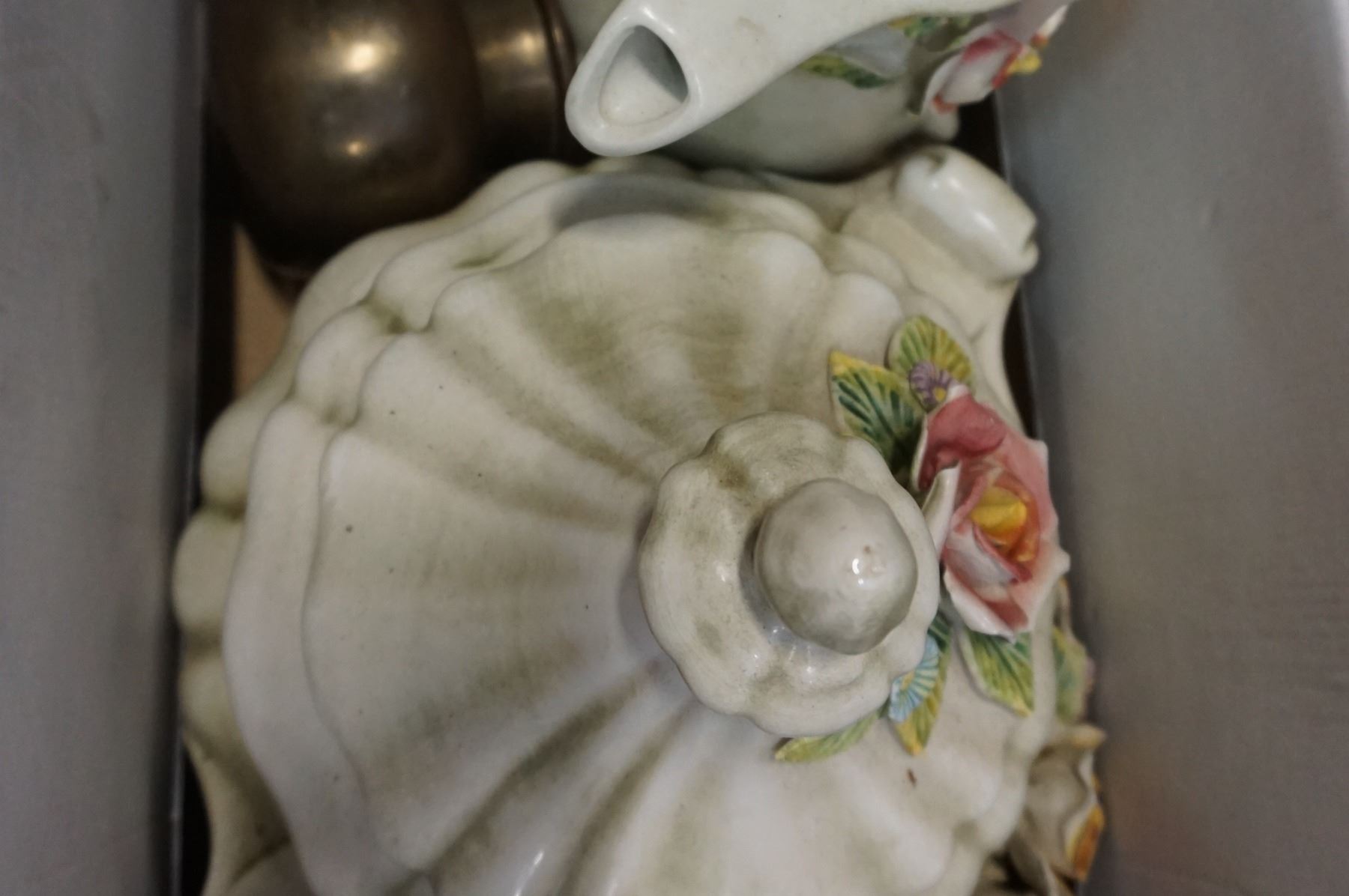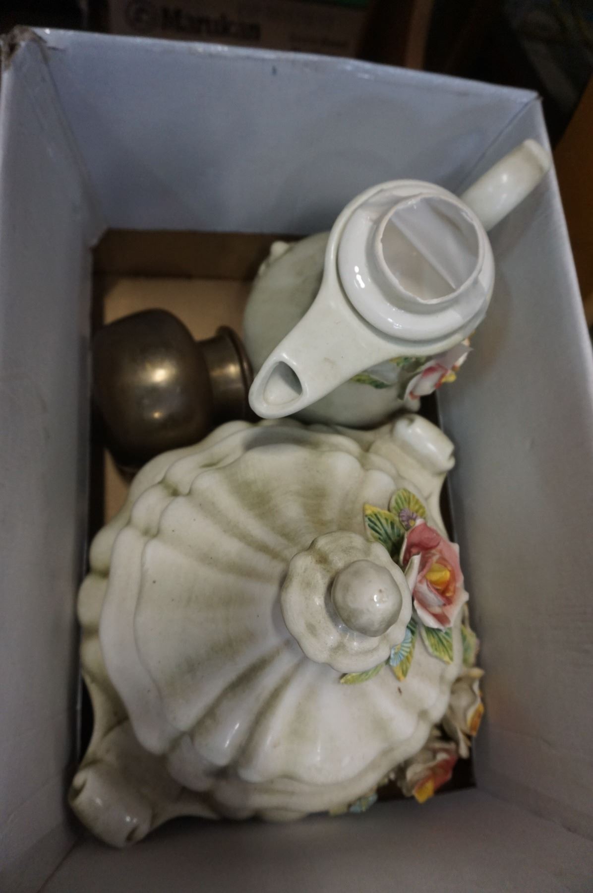 LARGE FLORAL TEAPOT AND LIDDED DISH AND 2 ANTIQUE TINS
