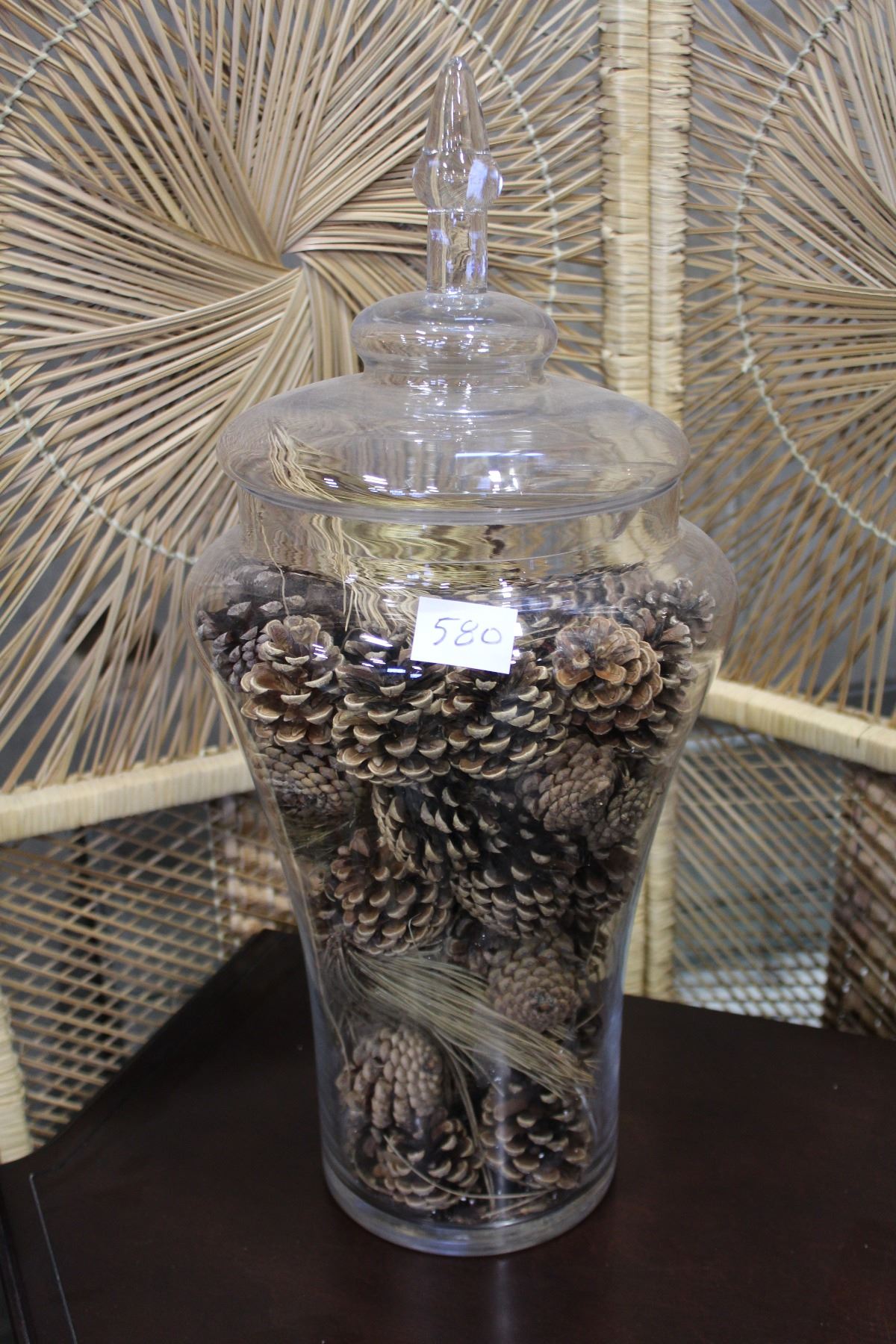 LARGE GLASS LIDDED CONTAINER WITH DECORATIVE PINECONES