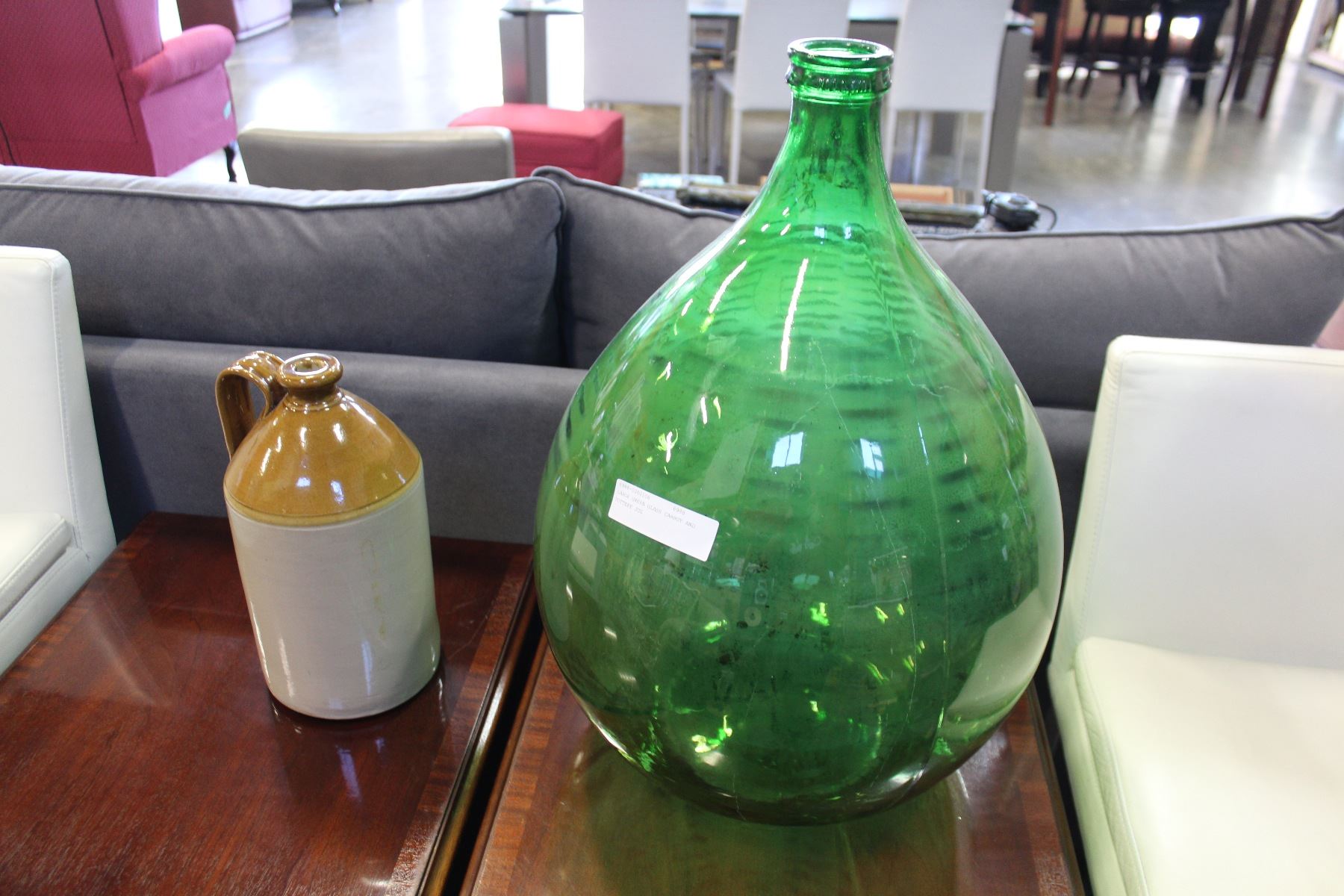 LARGE GREEN GLASS CARBOY AND POTTERY JUG