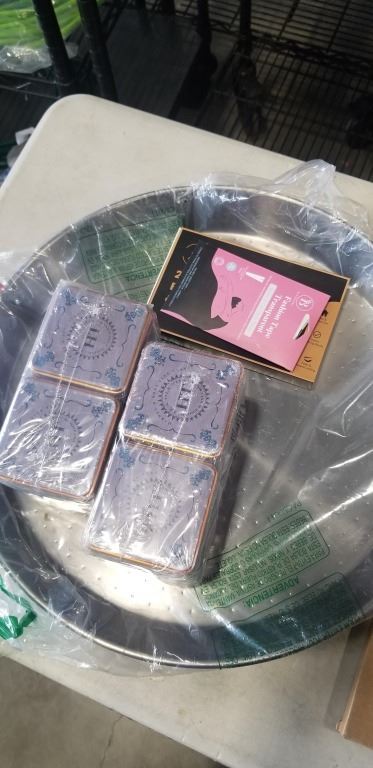 LARGE LOT INCLUDING BAKING PAN, 4 TINS OF BLACK CURRANT TEA BAGS, BLOOMORA MOISTURIZING FOOT MASK, 1