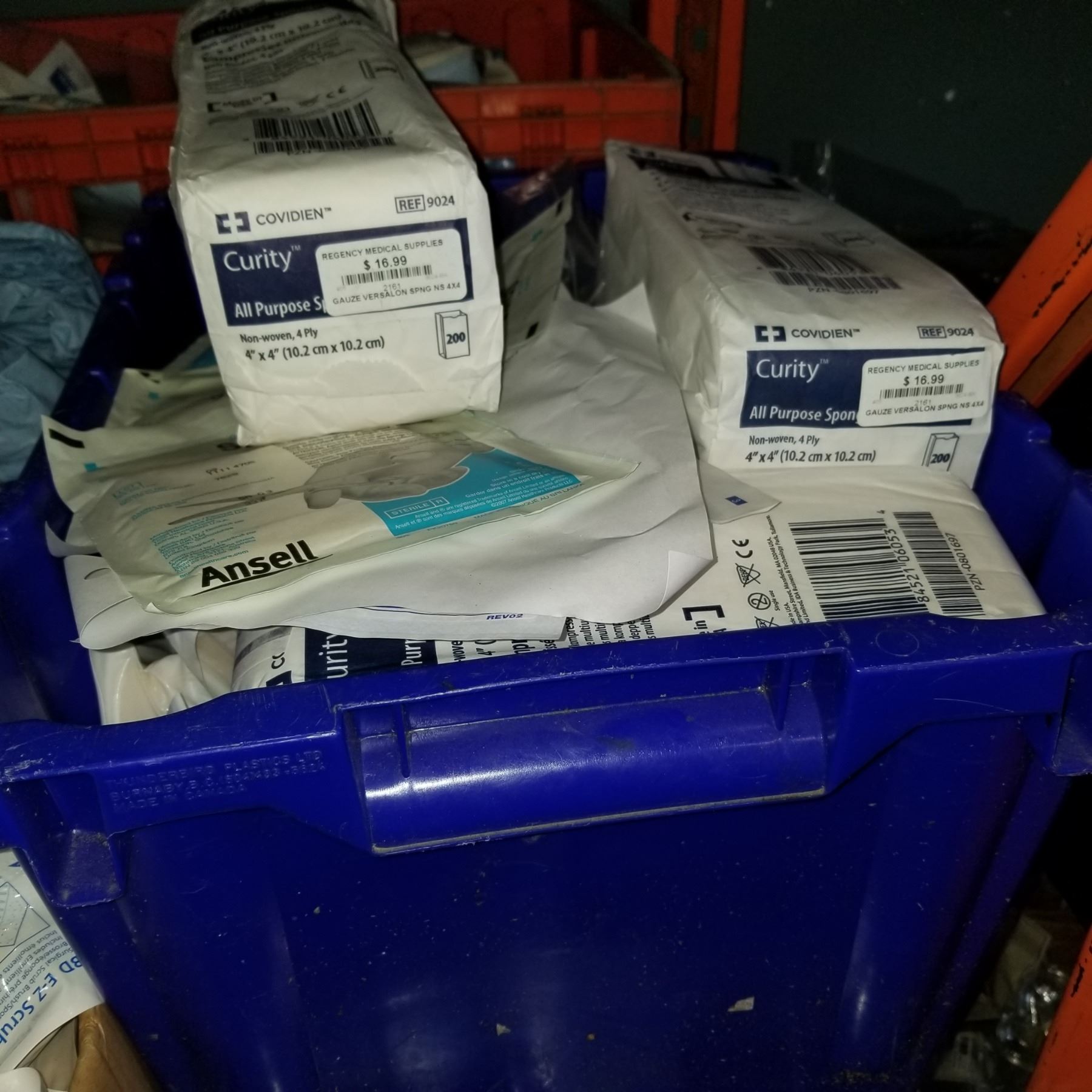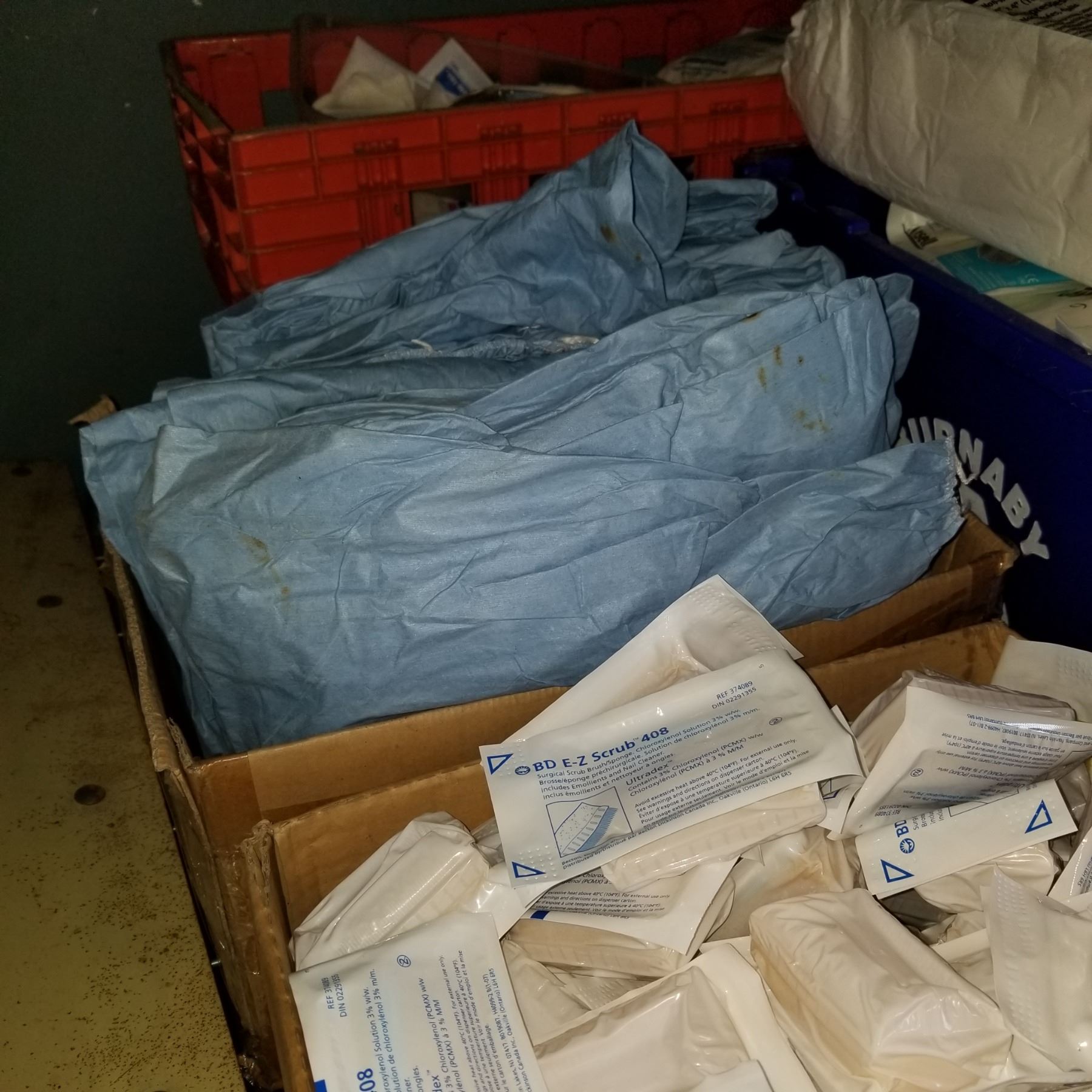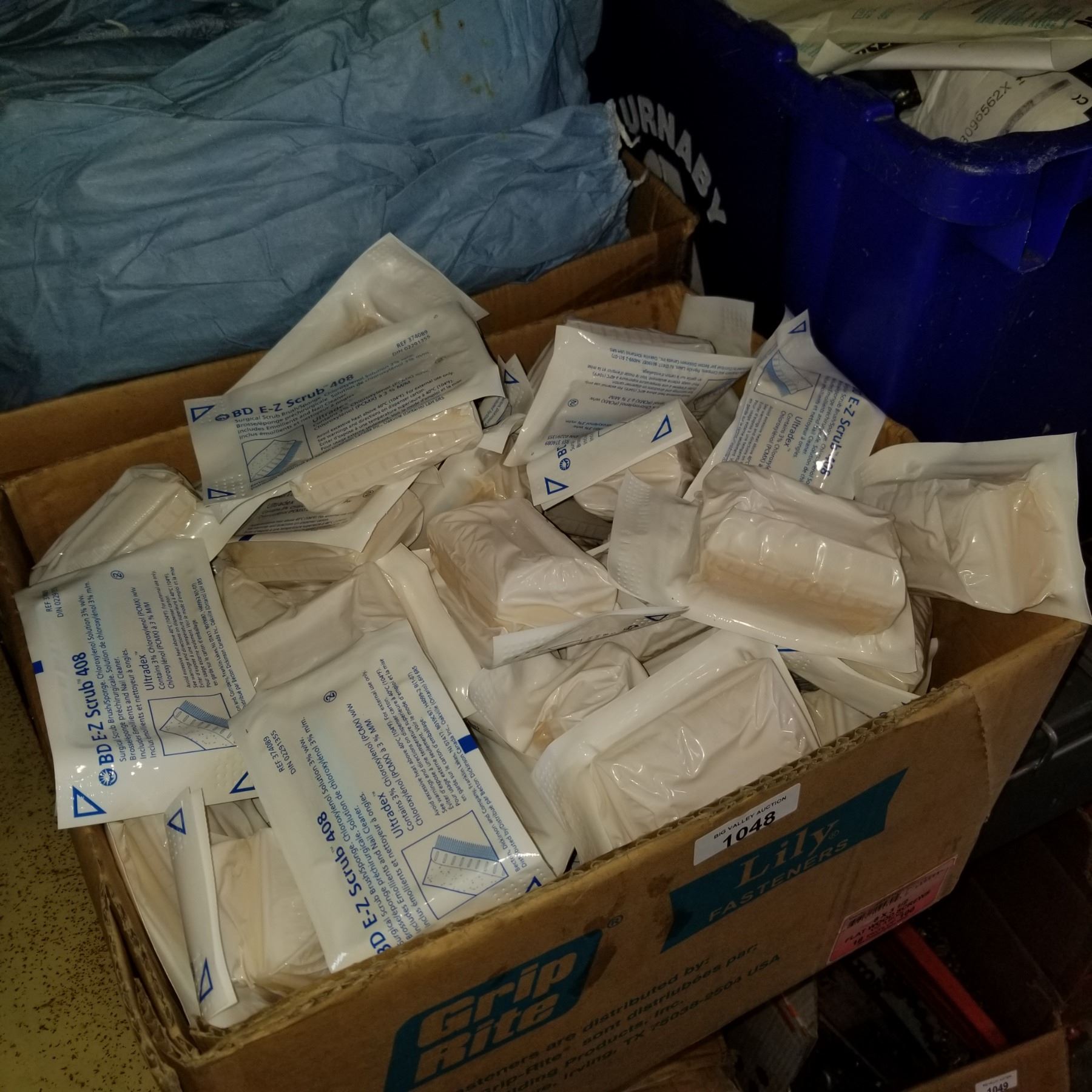 LARGE LOT OF EX SCRUB BRUSHES, DISPOSABLE GLOVES AND COVERALLS