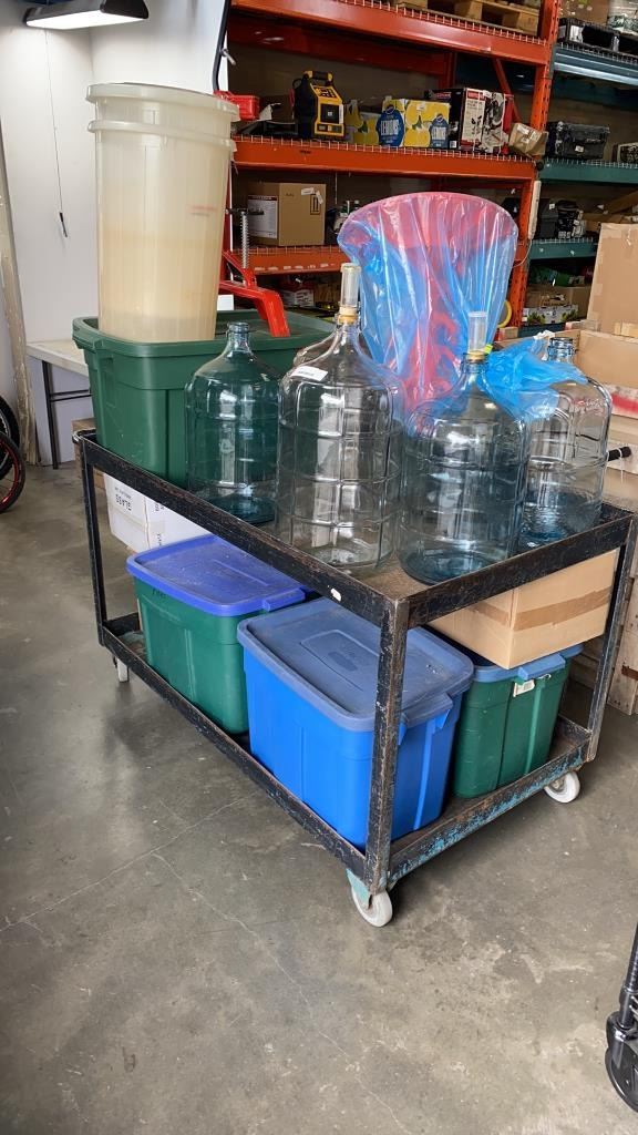 LARGE LOT OF GLASS CARBOYS, BOTTLE CORKER, DRYER AND WINE BOTTLES - 7 GLASS CARBOYS, APPX 200 BOTTLES