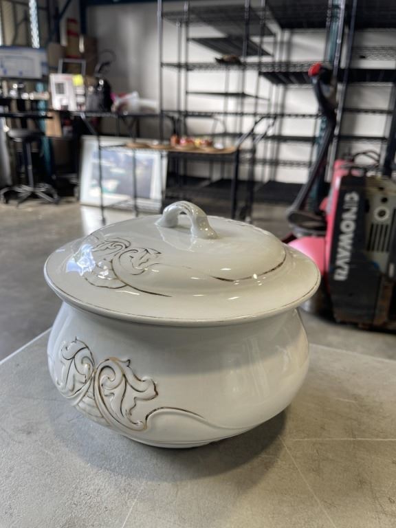 LARGE LOT OF LIDDED TUREENS, CERAMIC PLANETRS, GLASS LIDDED VASES ETC