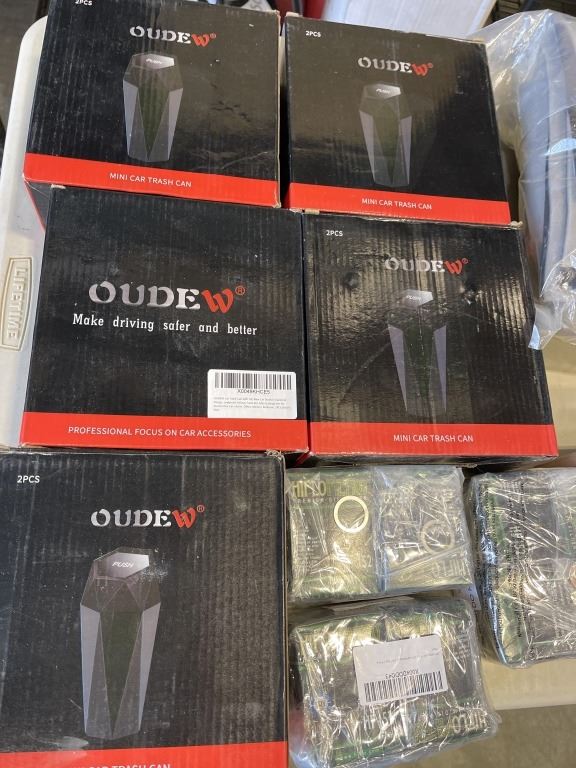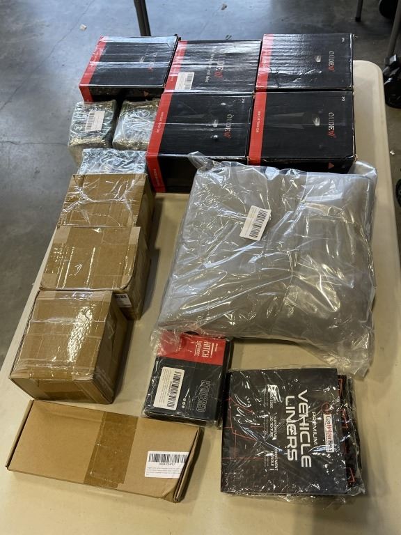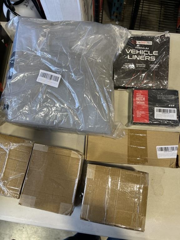 LARGE LOT OF NEW AUTOMOTIVE ITEMS INLCUDING HITCH TIGHTENERS, GARBAGE CANS, RESONATOR FILTERS AND MORE