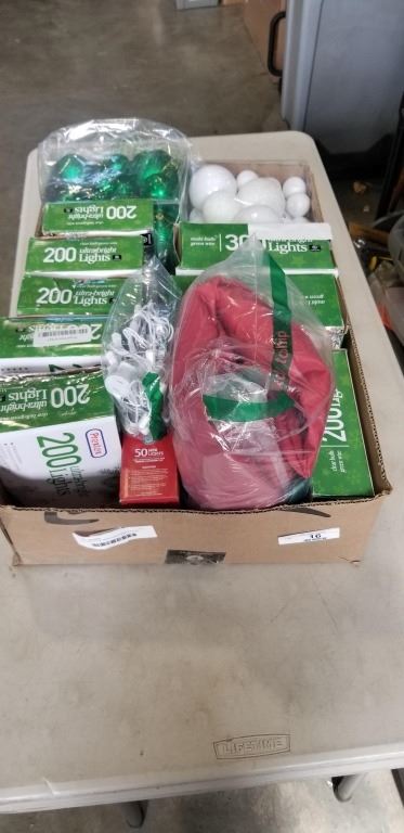 LARGE LOT OF NEW CHRISTMAS DECOR, INCLUDING LIGHT SETS, BALLS, AND TREE STORAGE BAG