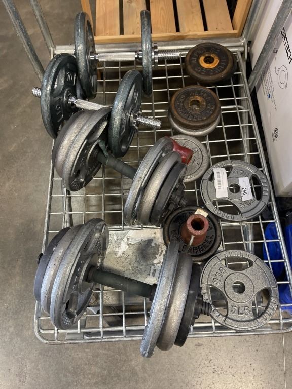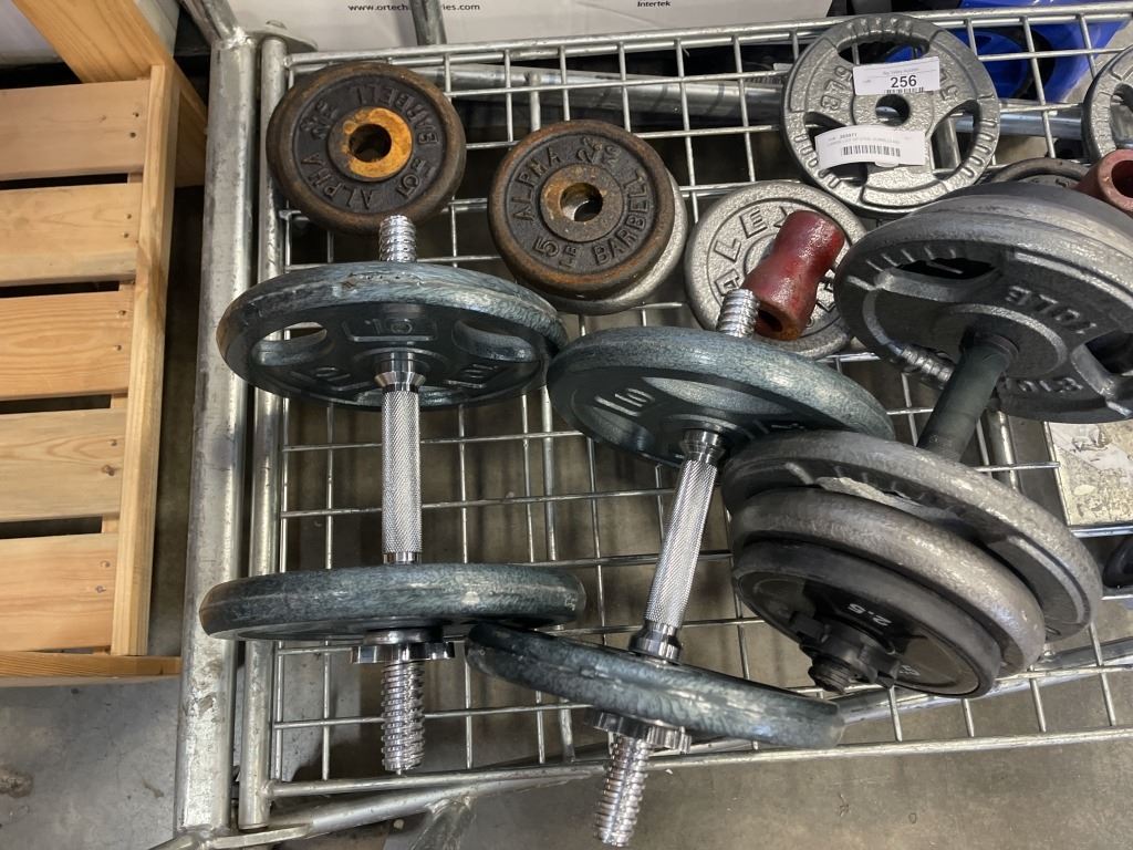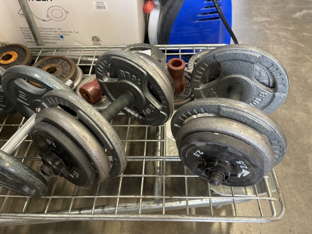 LARGE LOT OF STEEL DUMBELLS AND PLATES
