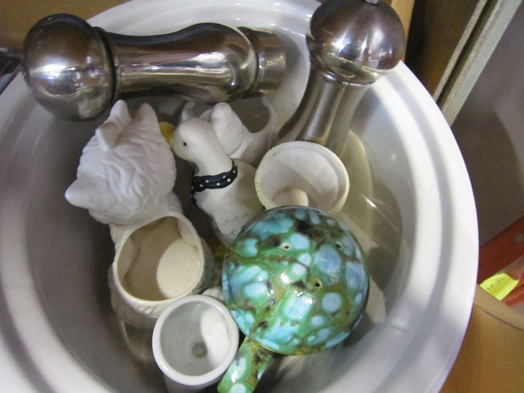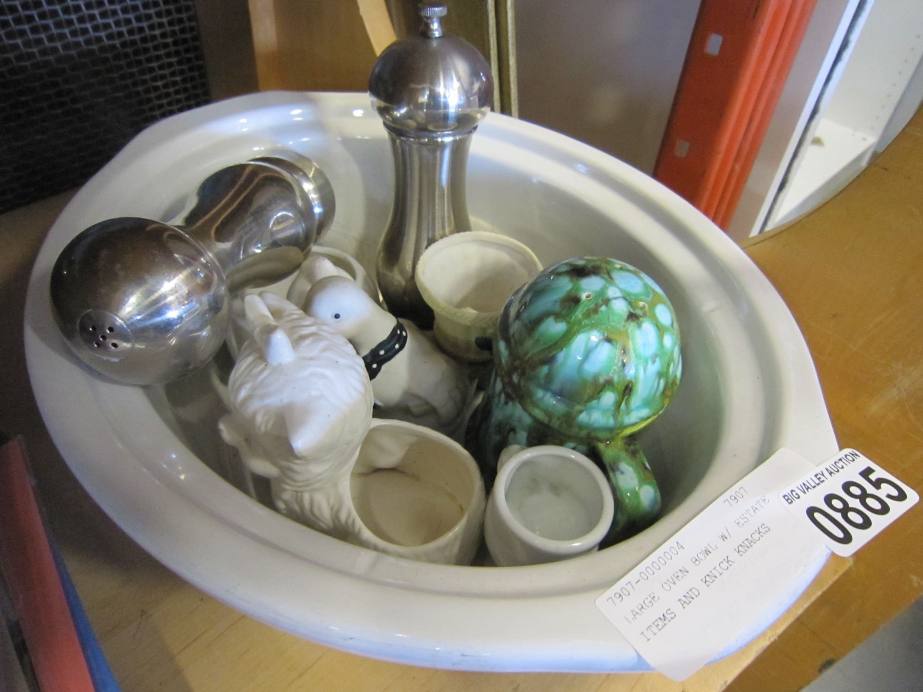 LARGE OVEN BOWL W/ ESTATE ITEMS AND KNICK KNACKS