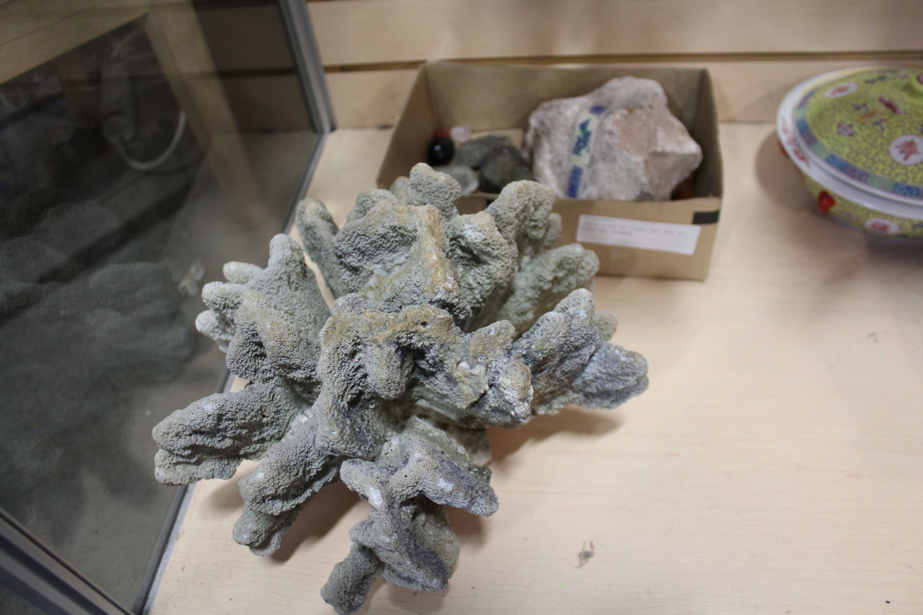 LARGE PIEE OF CORAL AND BOX OF PRECIOUS STONES