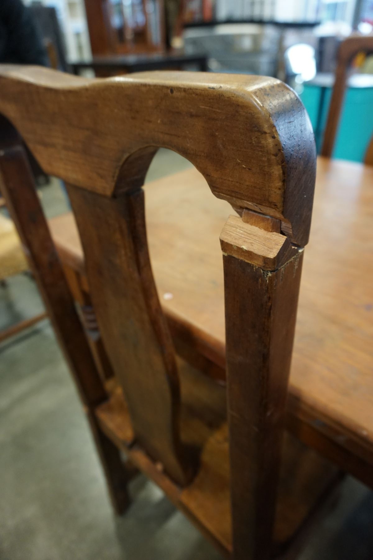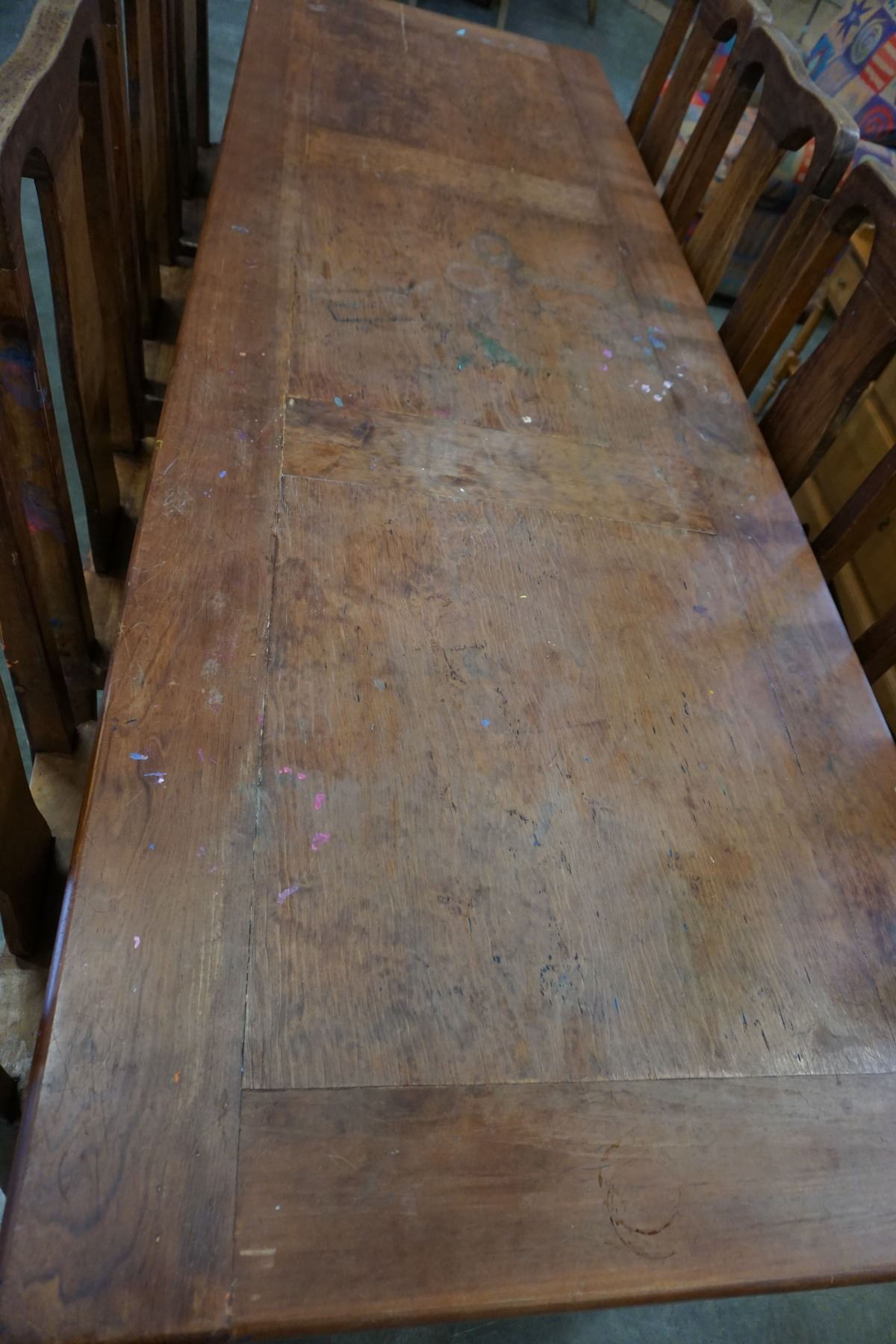 LARGE RUSTIC HARVEST TABLE 8FT BY 32IN AND 8 WOOD CHAIRS