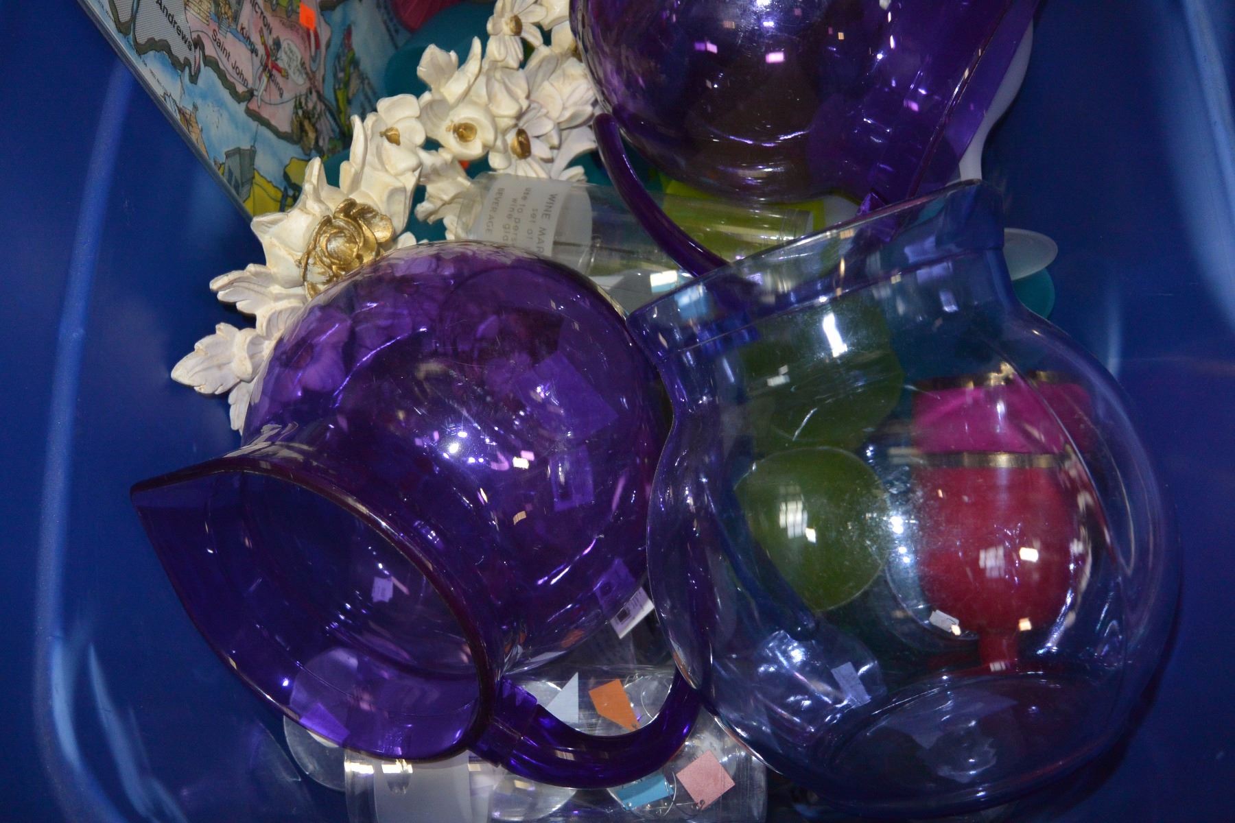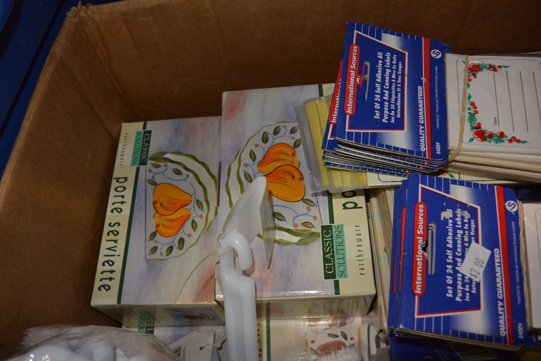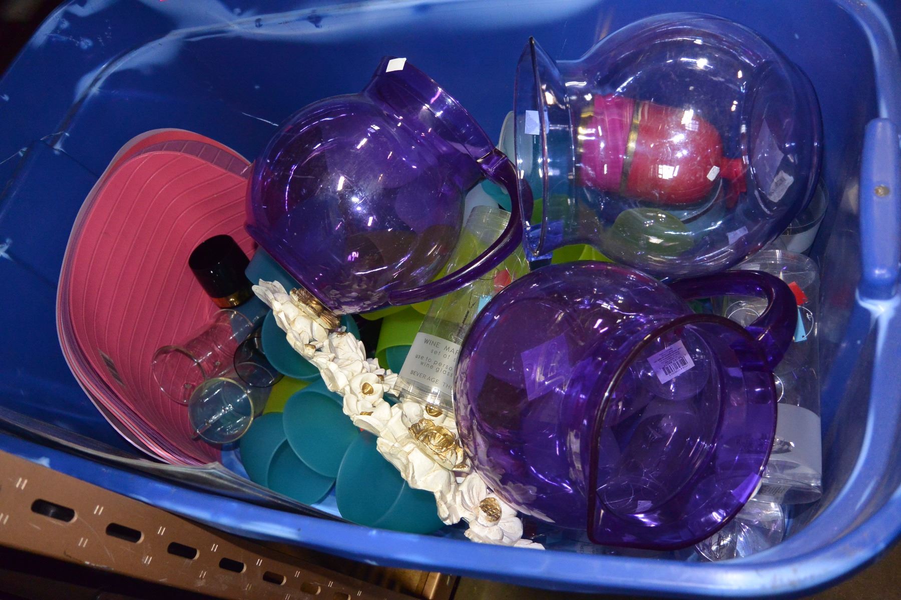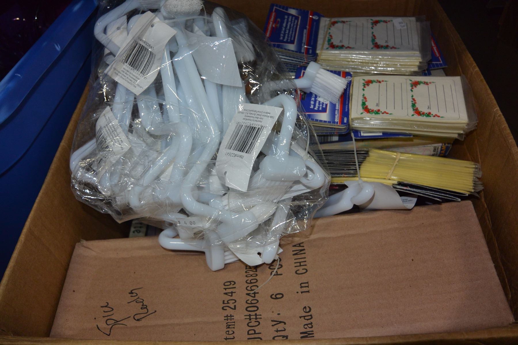 LARGE TOTE OF PLASTIC DISHES AND BOX OF NEW ITEMS CHESSE SHAKERS BRUSHES NOTEPADS ETC