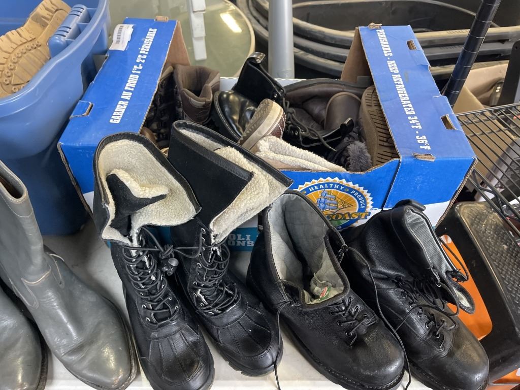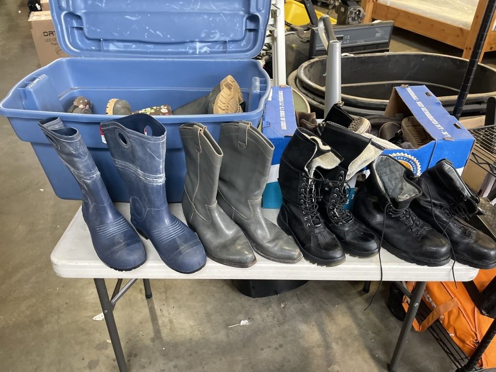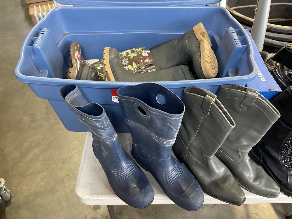 LARGE TOTE OF RUBBER AND WINTER BOOTS, ASSORTED SIZE AND BOX OF SHOES AND BOOTS