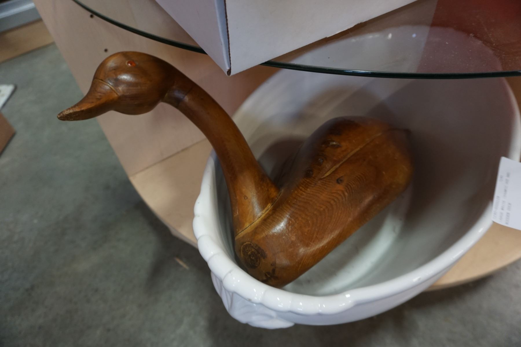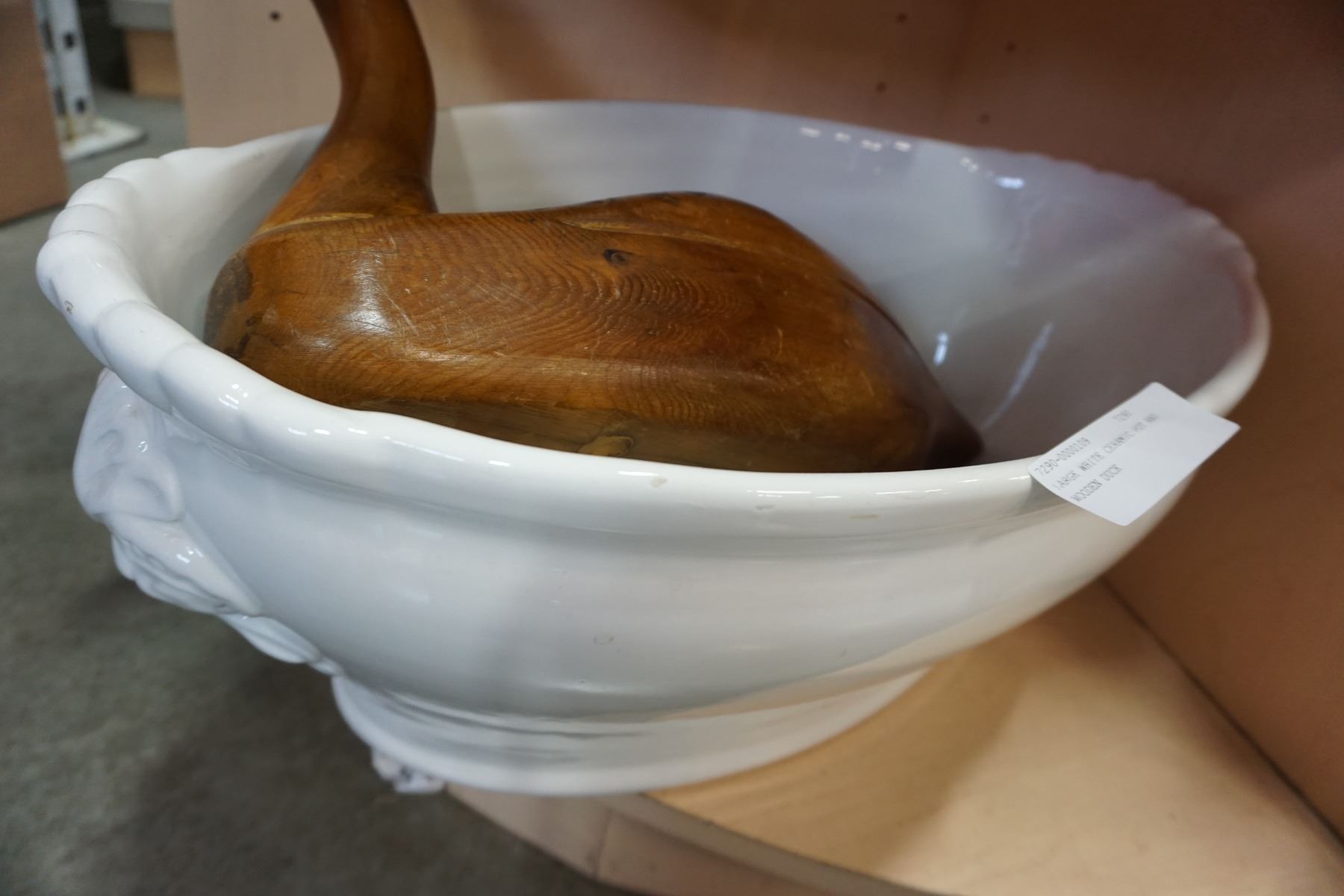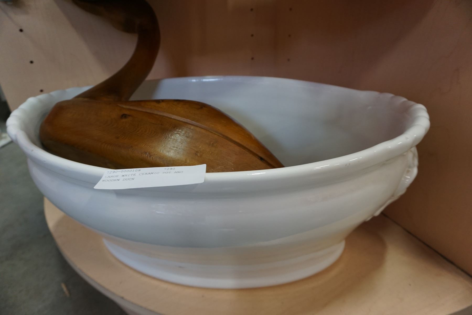 LARGE WHITE CERAMIC POT AND WOODEN DUCK