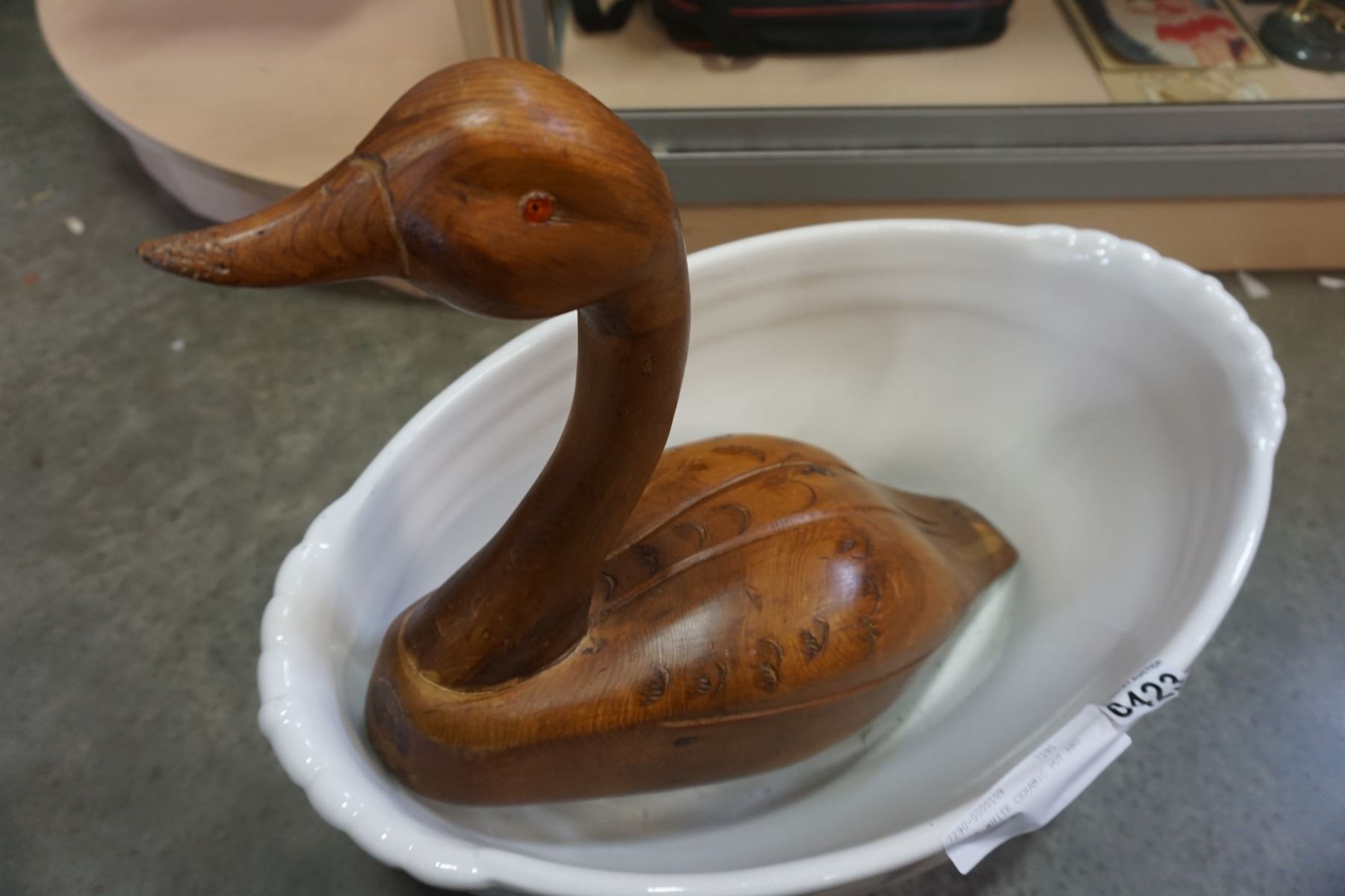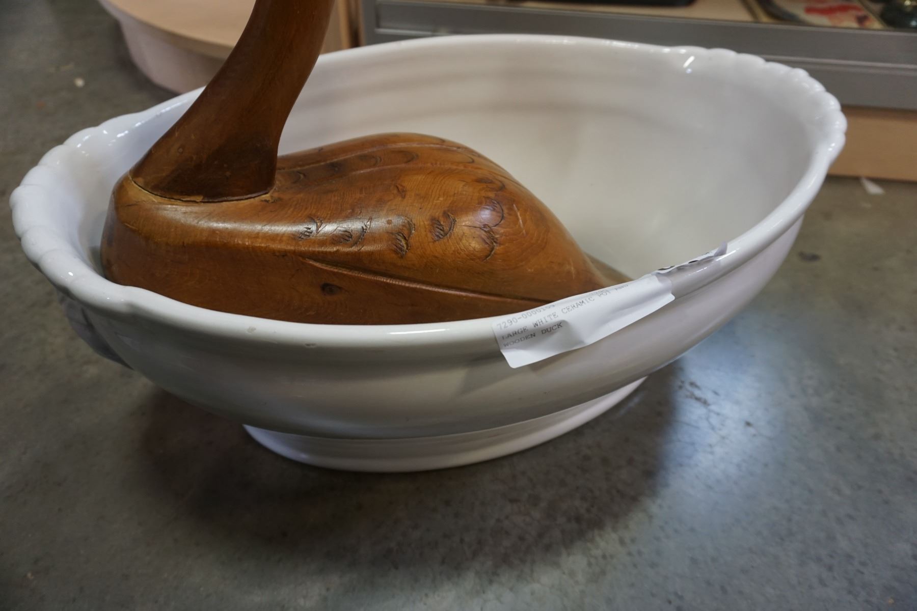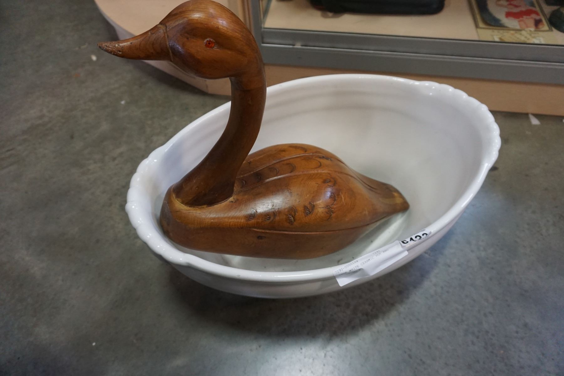 LARGE WHITE CERAMIC POT AND WOODEN DUCK
