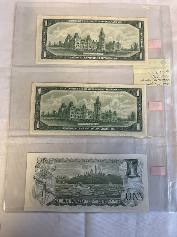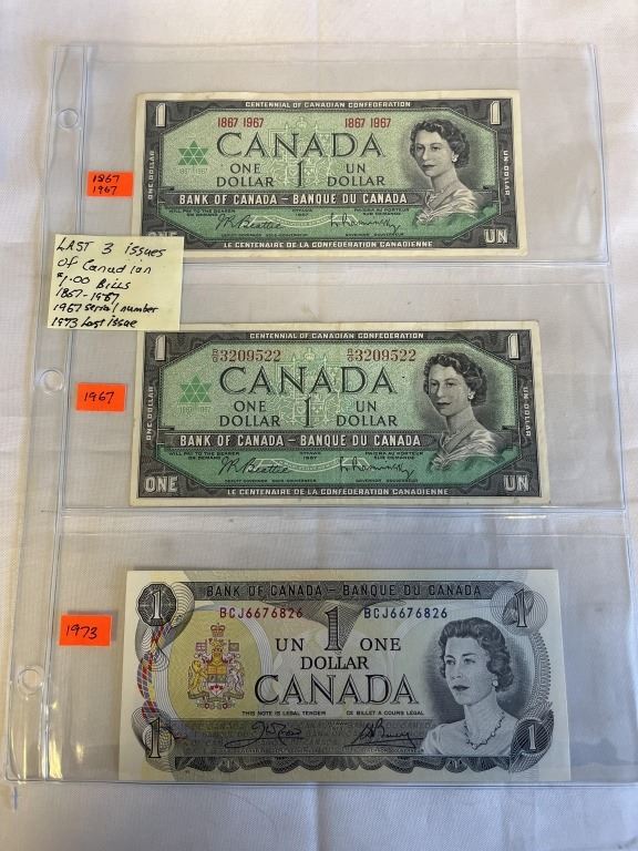 LAST 3 ISSUES OF CANADIAN$1 BILL 1867-1967, 1967 SERIAL NUMBER AND 1973 LAST ISSUE OF $1 BILL