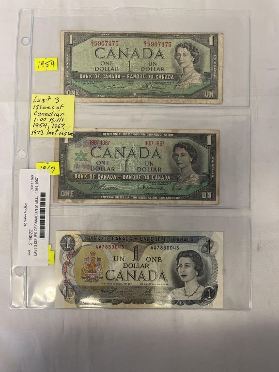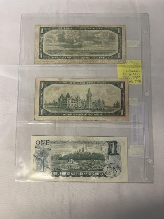 LAST 3 ISSUES OF CANADIAN $1 BILL; - 1954, 1967, 1793
