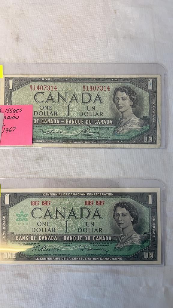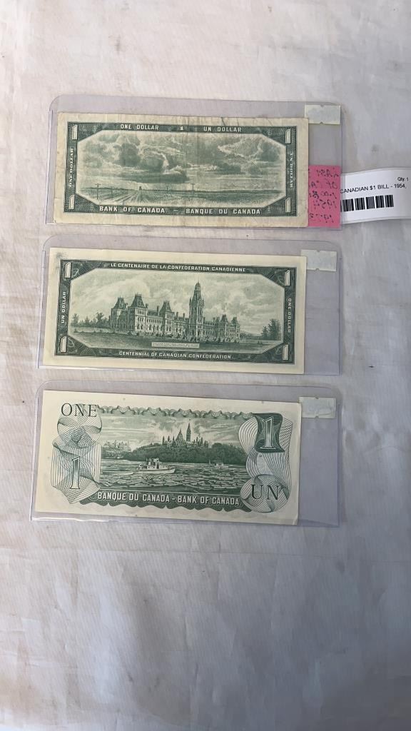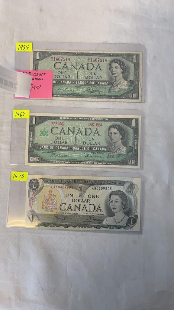 LAST 3 ISSUES OF CANADIAN $1 BILL - 1954, 1967, 1973