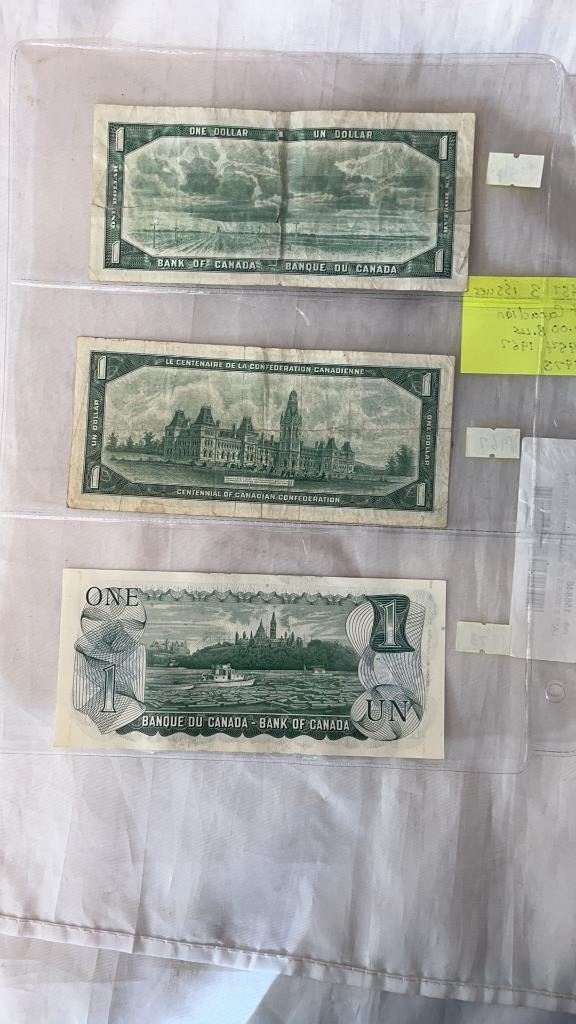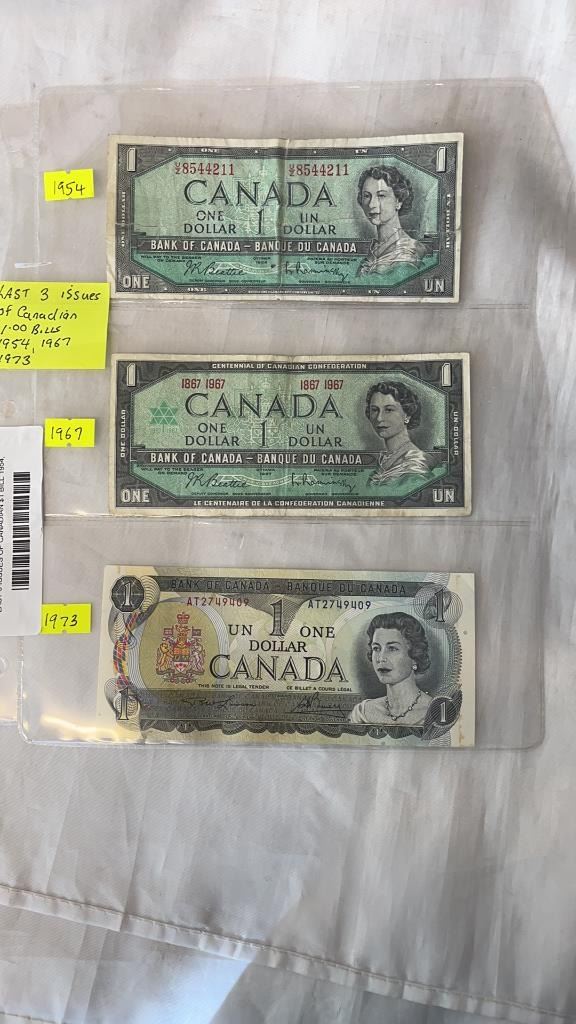 LAST 3 ISSUES OF CANADIAN $1 BILL 1954, 1967, 1973