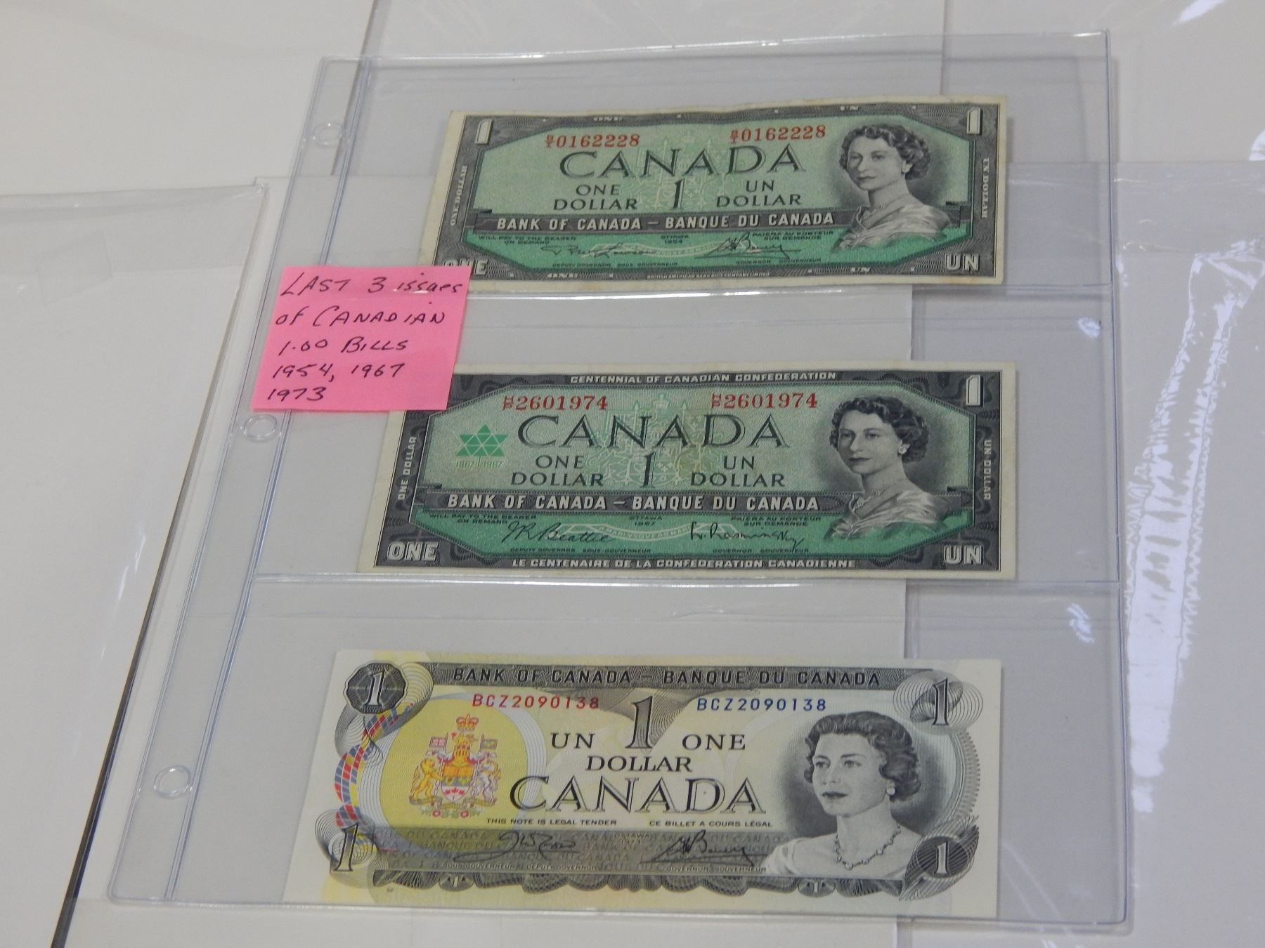 LAST 3 ISSUES OF CANADIAN 1 DOLLAR BILL 1954, 1967, 1973