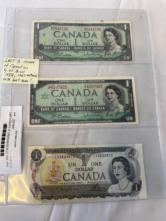 LAST 3 ISSUES OF CANADIAN $2 BILLS 1954, 1974, 1986 LAST ISSUE