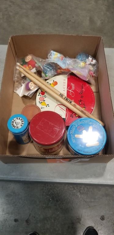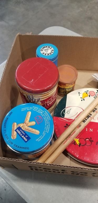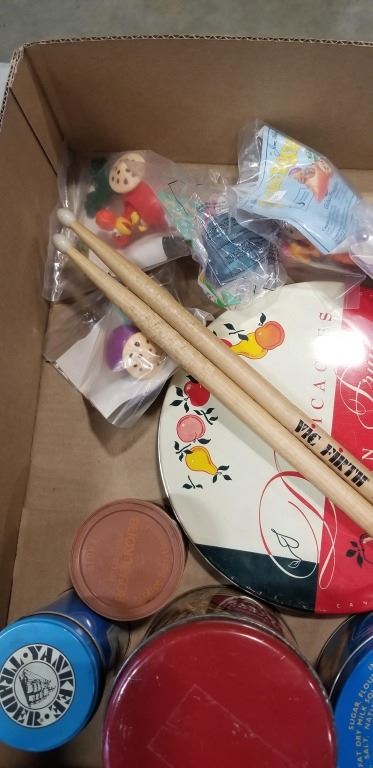 LATE 70'S COLLECTOR TINS, VINTAGE COLLECTIBLE MCDONALDS TOYS AND SIGNED DRUM STICKS RNR BIG K, WC