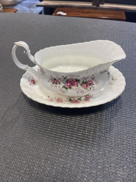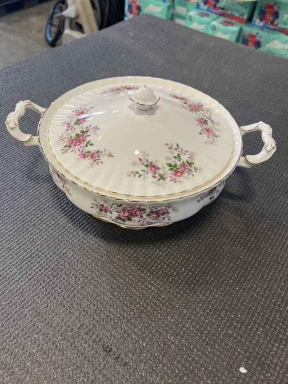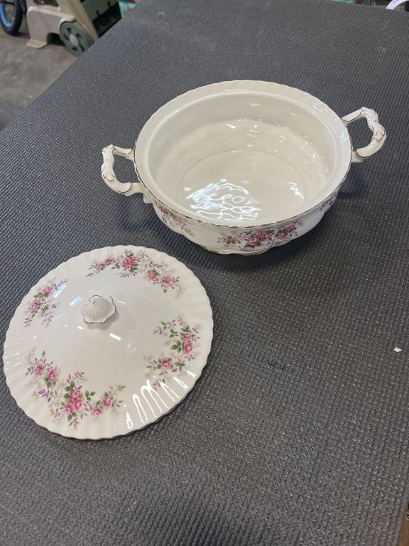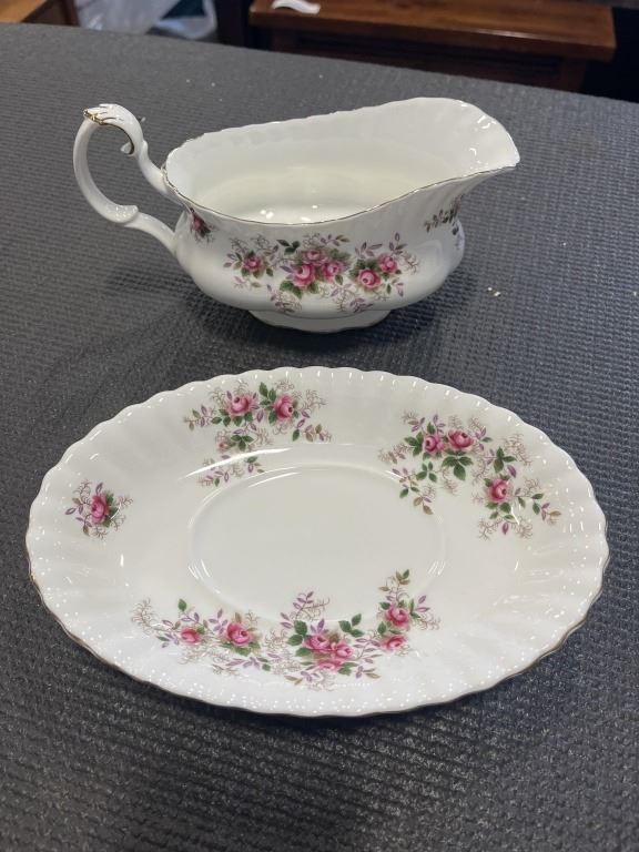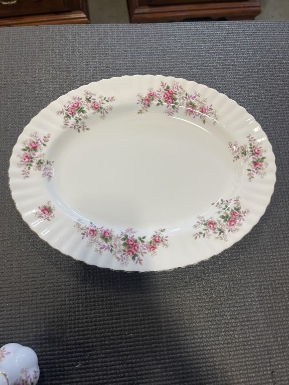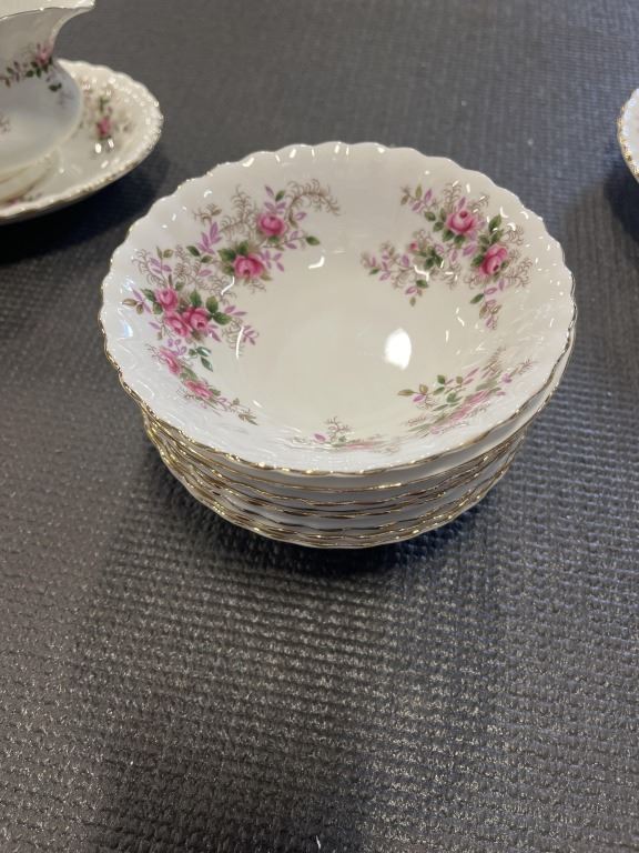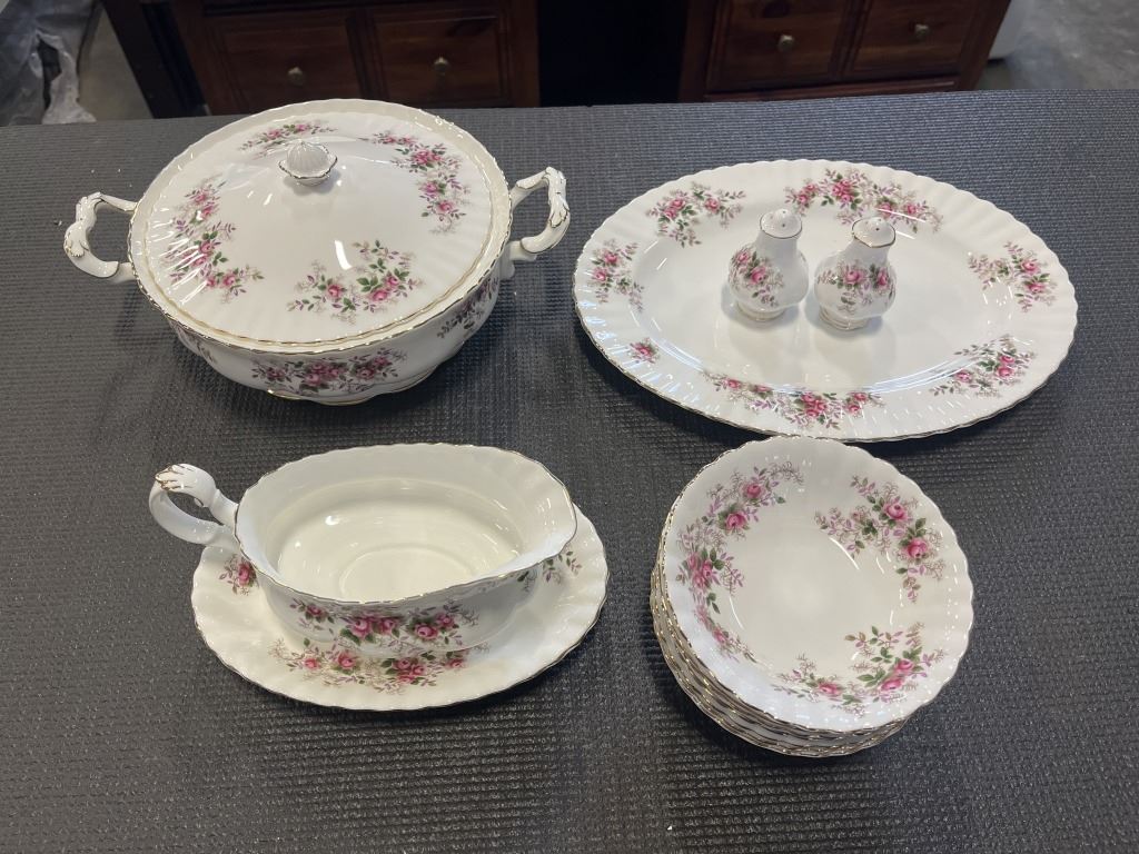 LAVENDER ROSE - ONE COVERED REGULAR DISH, 1 GRAVY BOAT AND SAUCER, SALT AND PEPPERS, 8 FRUIT NAPPIES. AND ONE PLATTER.