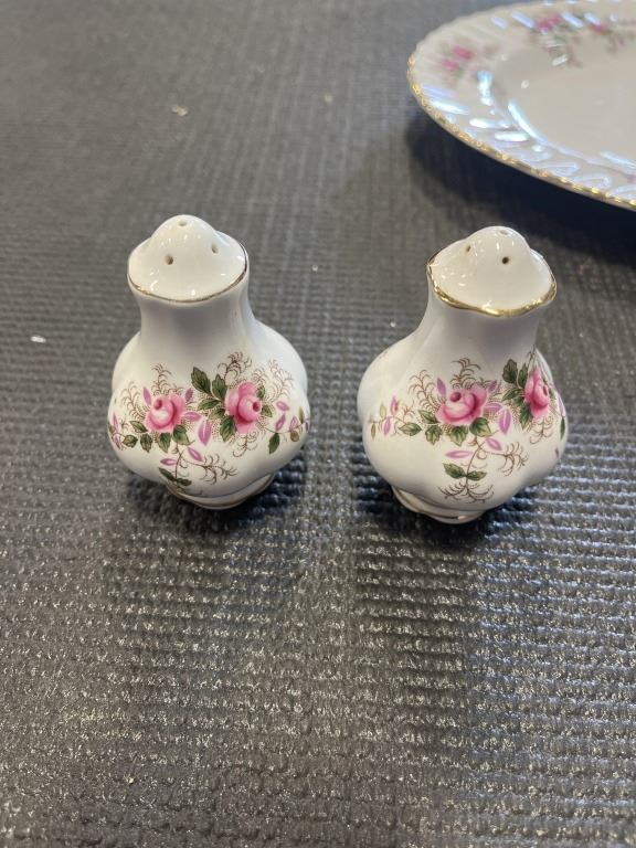 LAVENDER ROSE - ONE COVERED REGULAR DISH, 1 GRAVY BOAT AND SAUCER, SALT AND PEPPERS, 8 FRUIT NAPPIES