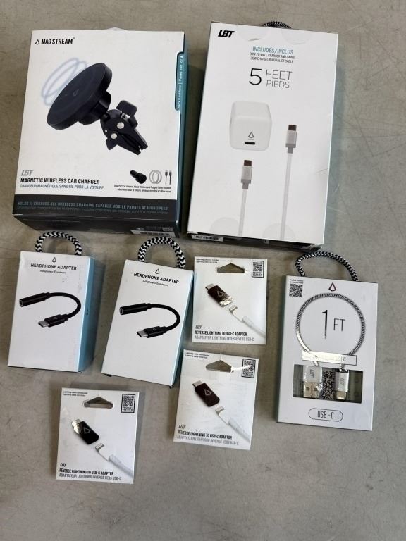 LBT MAGNETIC WIRELESS CAR CHARGER, 30W WALL CHARGER, HEADPHONE ADAPTERS, USB CABLE AND ADAPTERS