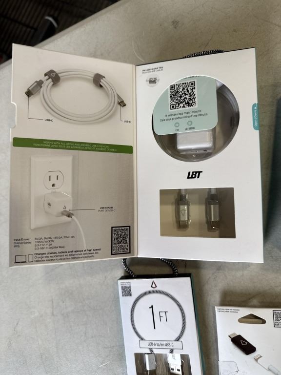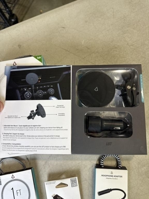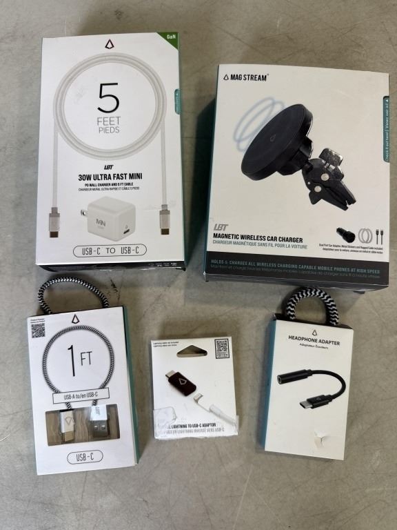 LBT MAGNETIC WIRELESS CAR CHARGER SET, 5 FOOT 30W ULTRA FAST MINI WALL CHARGER AND USB-C TO USB-C CABLE, 1 FOOT USB-A TO USB-C CABLE, HEADPHONE ADAPTOR, AND LIGHTNING TO USB-C ADAPTOR