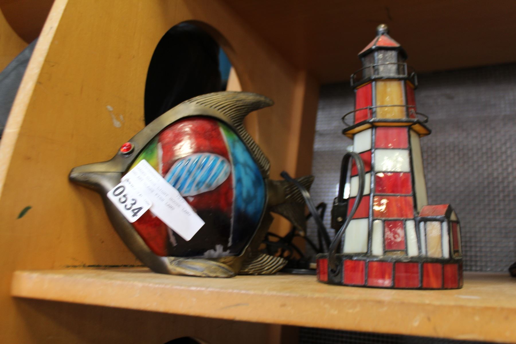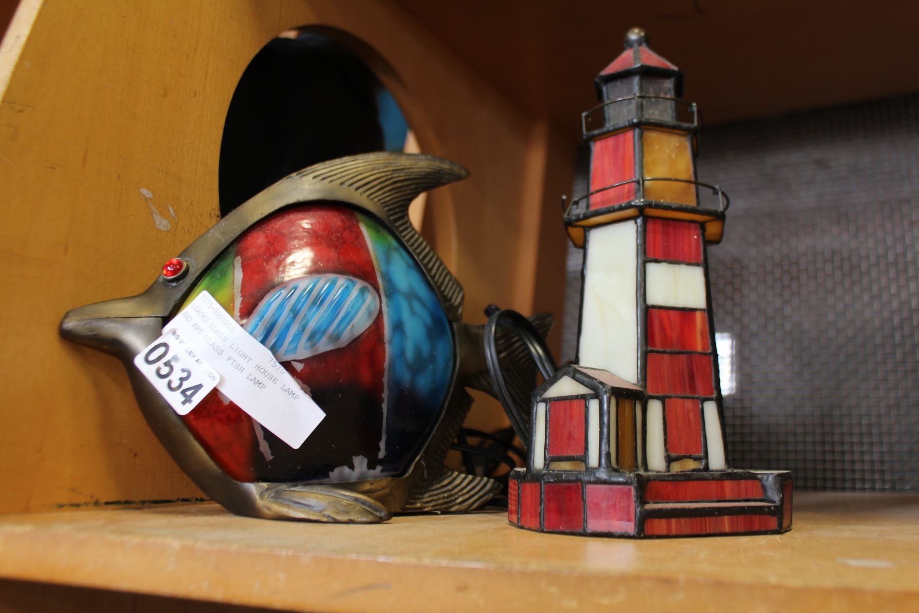 LEADED GLASS LIGHT HOUSE LAMP AND ART GLASS FISH LAMP