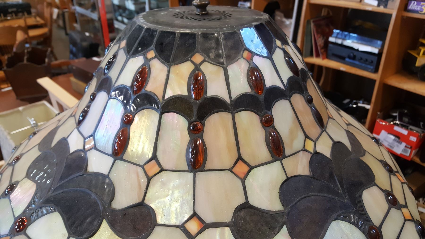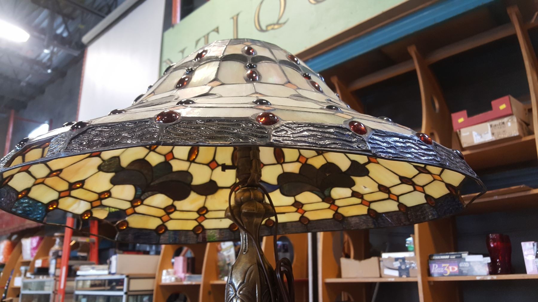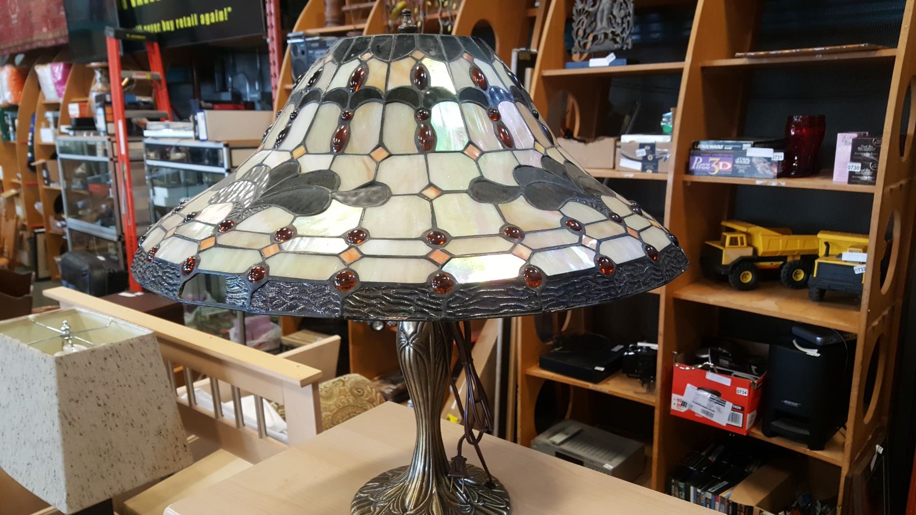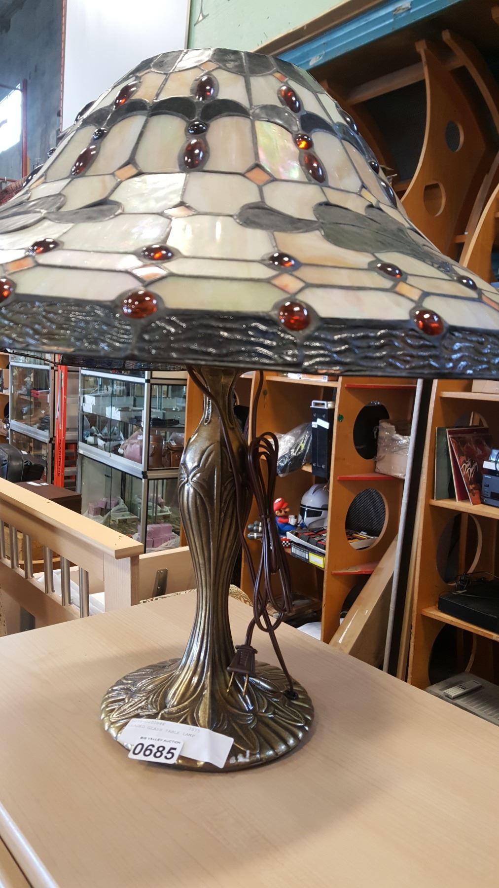 LEADED GLASS TABLE LAMP AS IS, DAMAGED SHADE