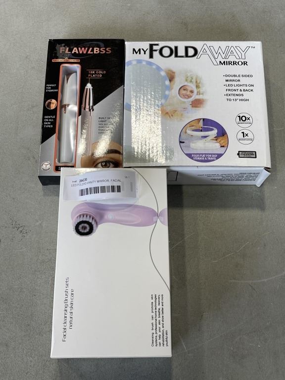 LED FOLDING VANITY MIRROR, FACIAL CLENSING BRUSH, AND FACIAL HAIR REMOVAL TOOL