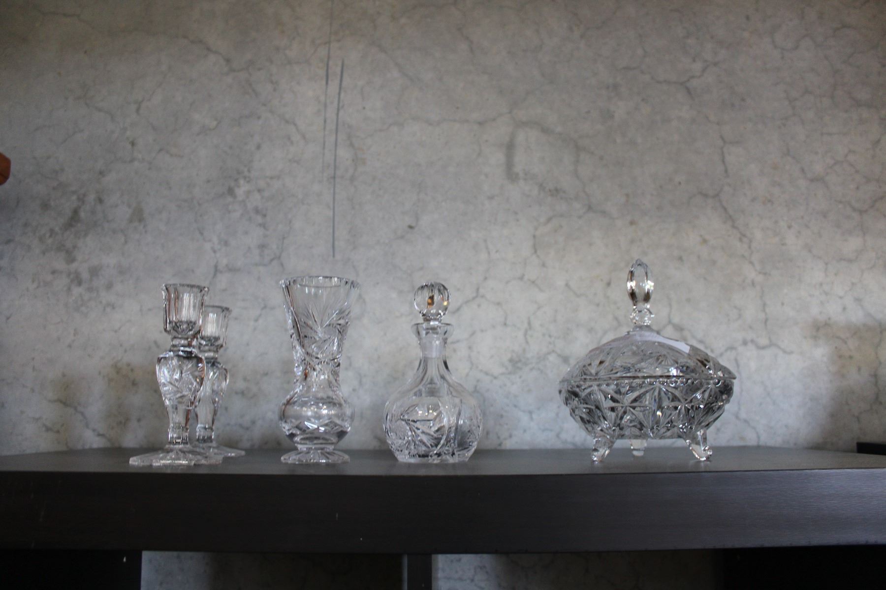 LIDDED CRYSTAL MINT DISH PERFUME BOTTLE CANDLESTICKS AND VASE