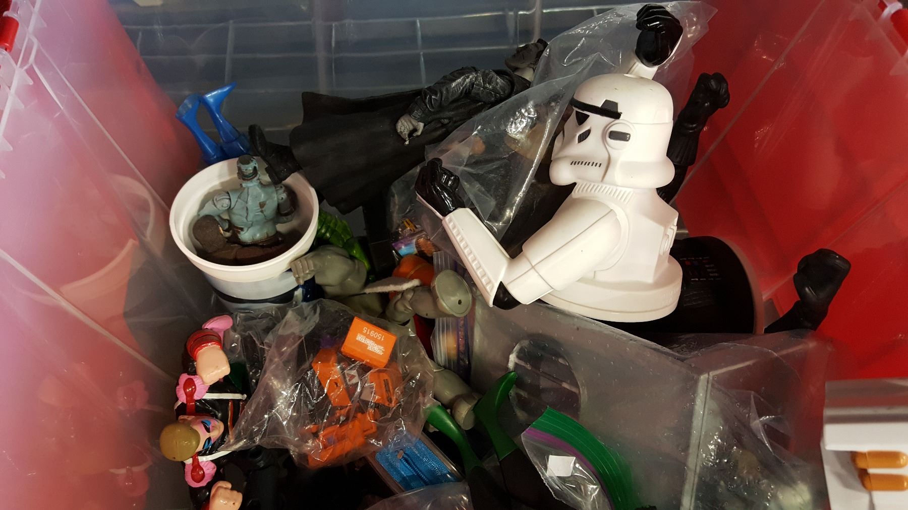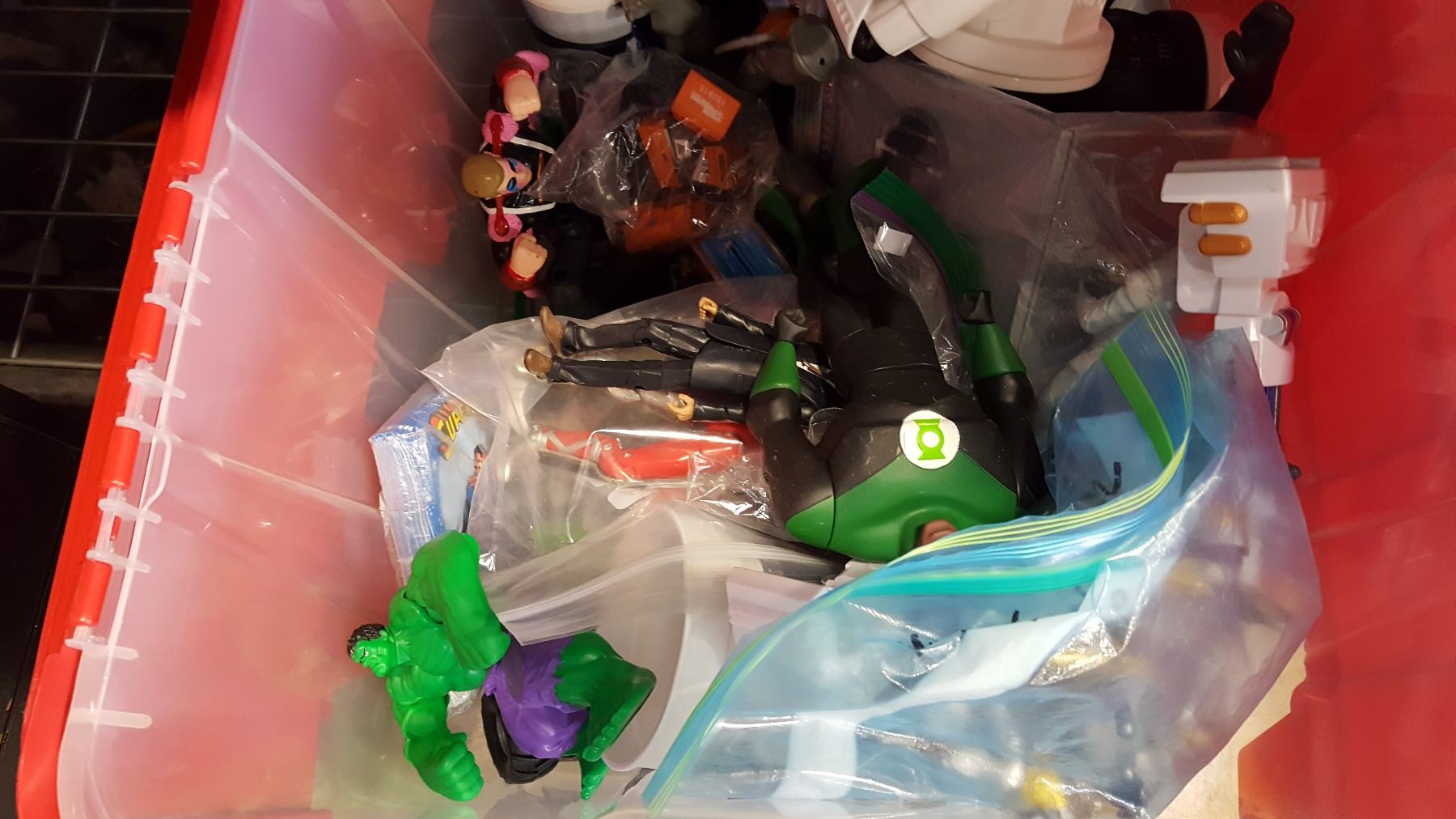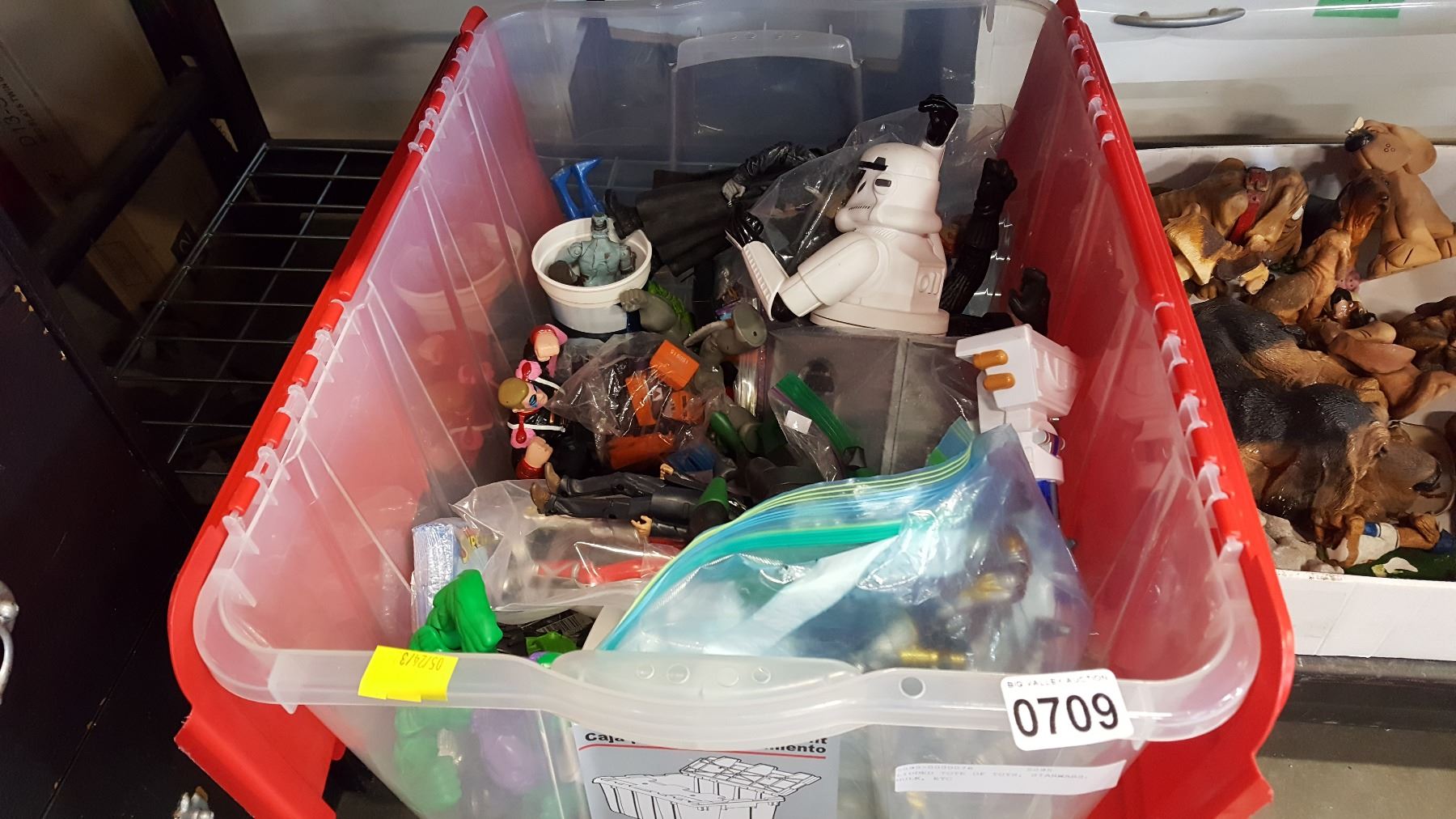 LIDDED TOTE OF TOYS, STARWARS, HULK, ETC
