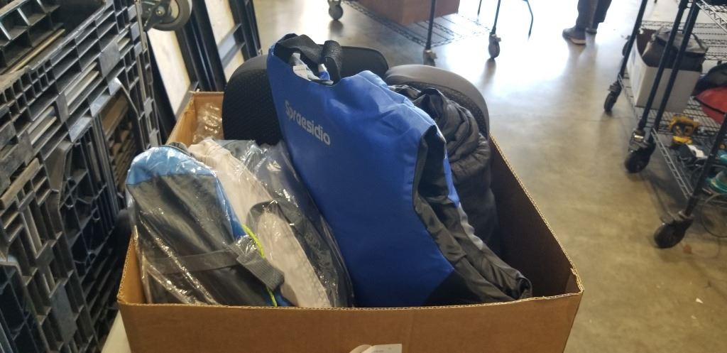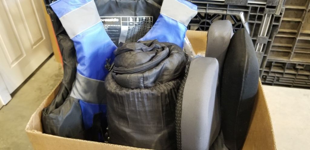 LIFE JACKET, COLLAPSIBLE PADDLES, SLEEPING BAG, SEAT CUSHIONS ETC