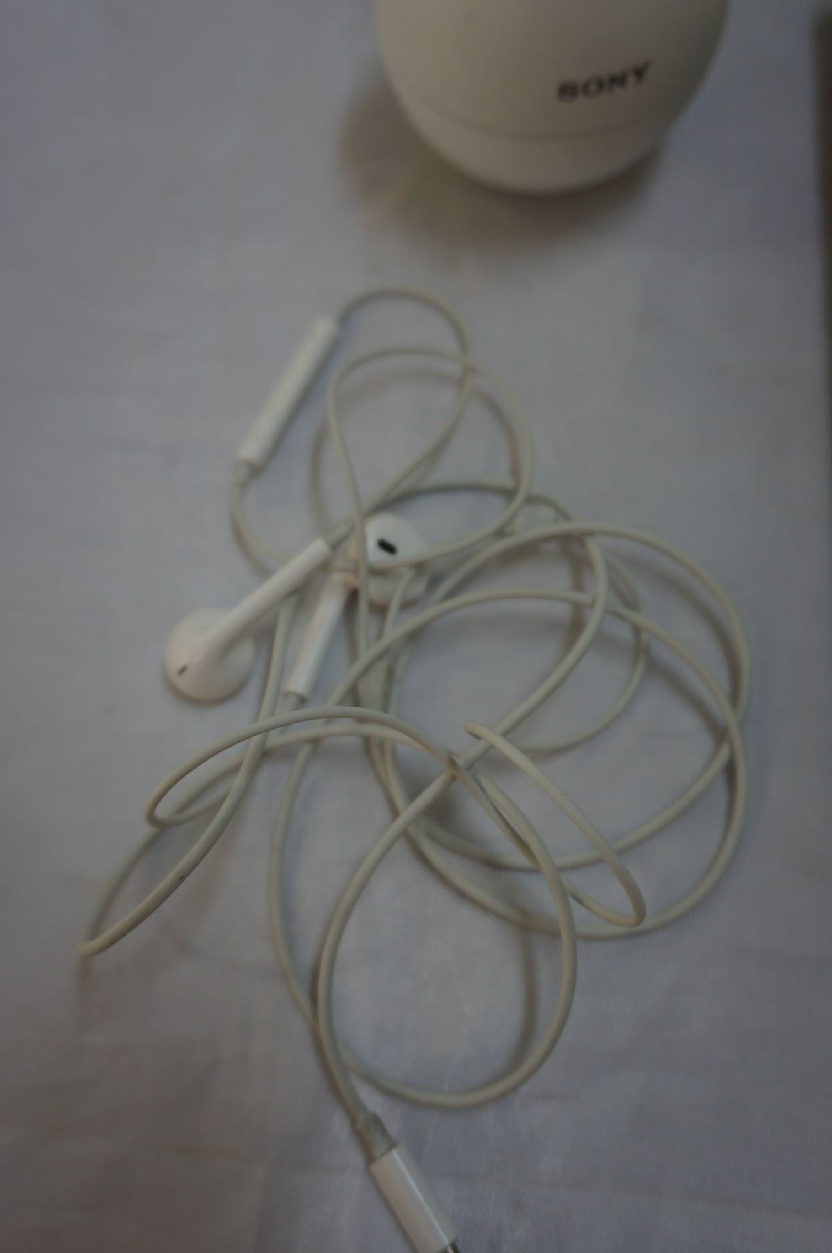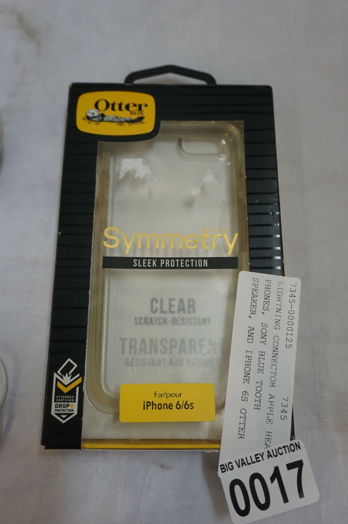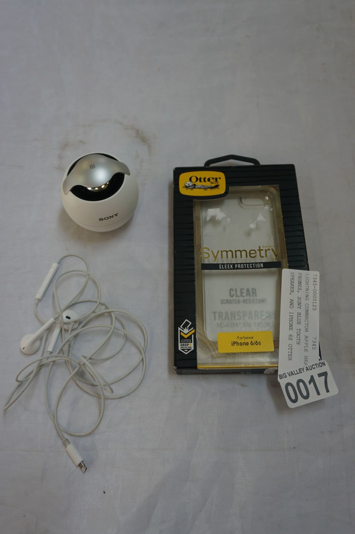 LIGHTNING CONNECTOR APPLE HEAD PHONES, SONY BLUE TOOTH SPEAKER, AND IPHONE 6S OTTER CASE