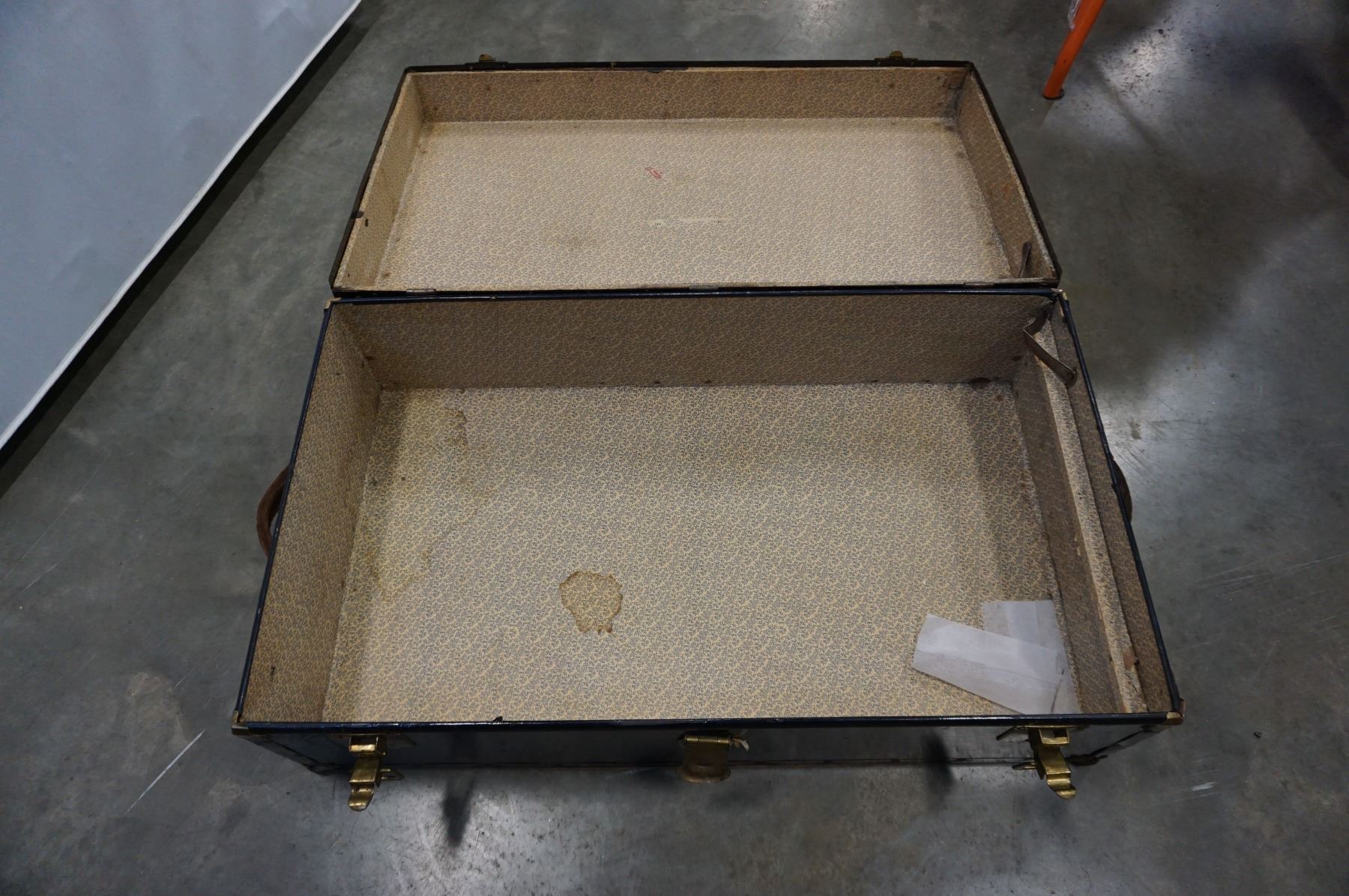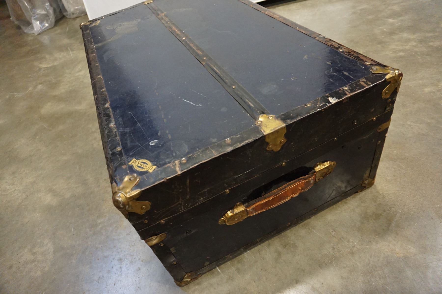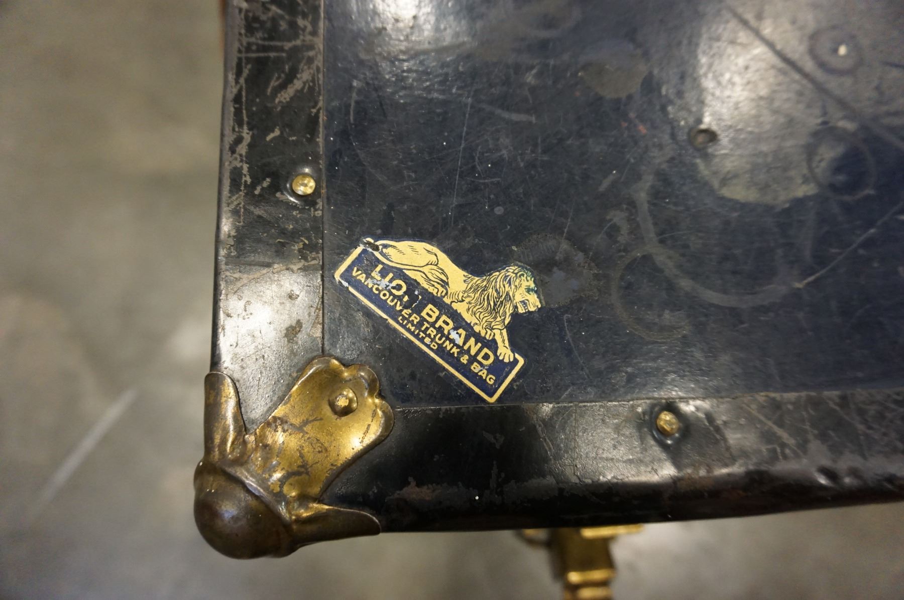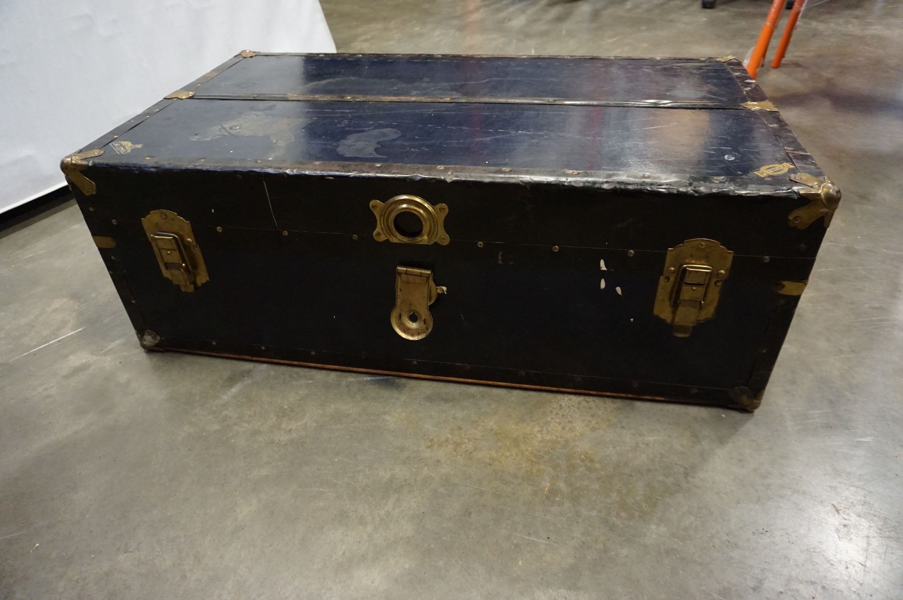 LION BRAND BLUE AND BLACK METAL BOUND TRUNK