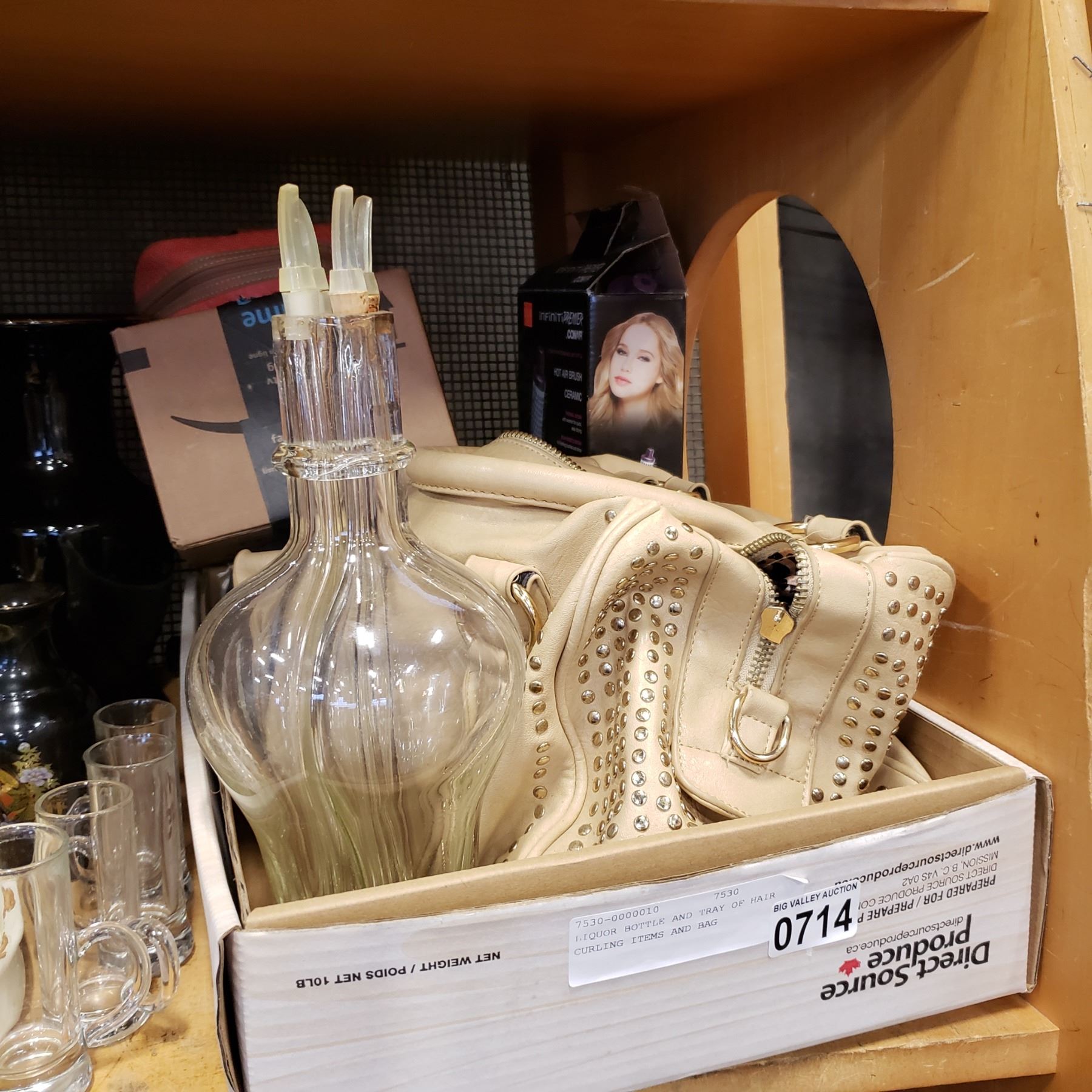 LIQUOR BOTTLE AND TRAY OF HAIR CURLING ITEMS AND BAG