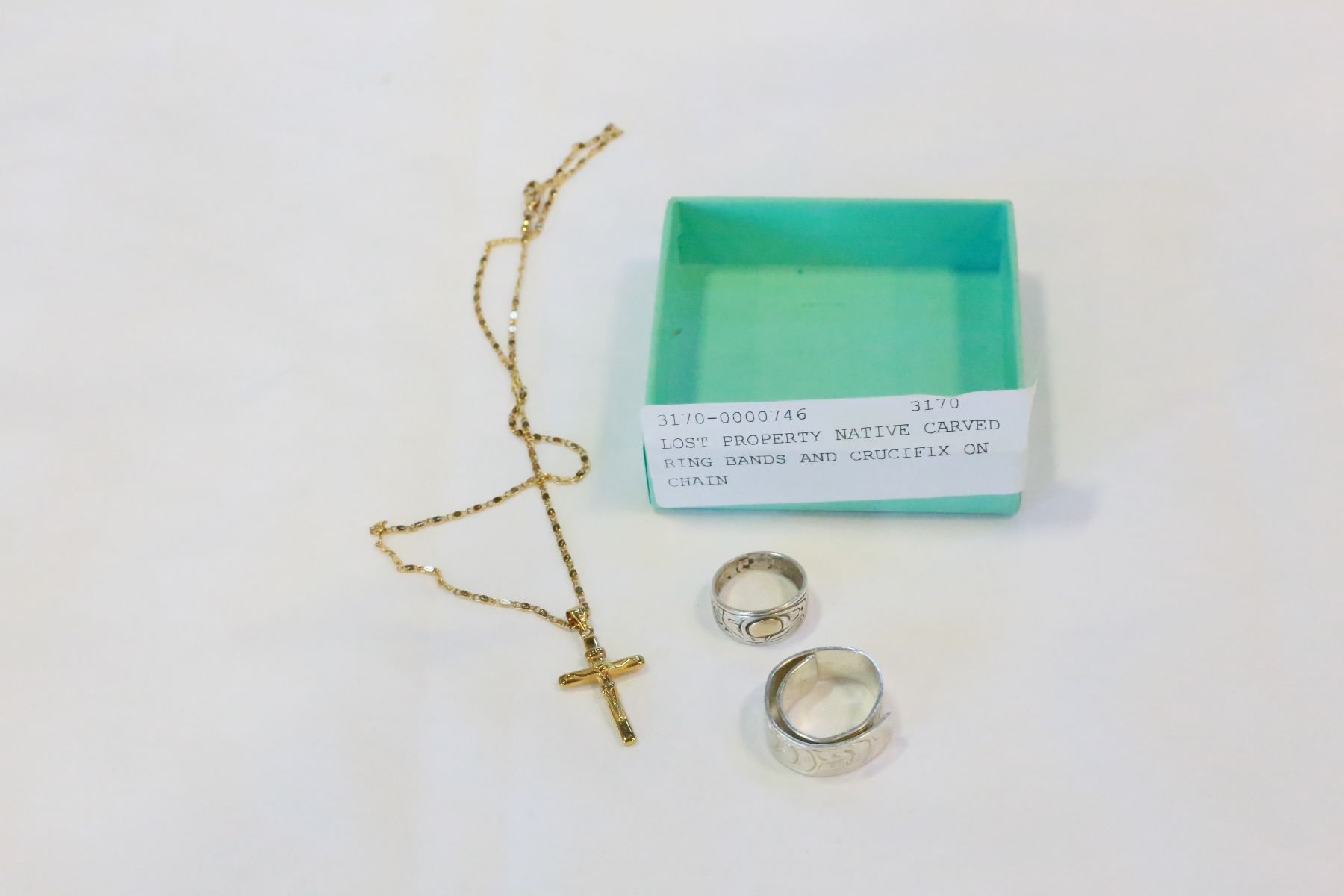 LOST PROPERTY NATIVE CARVED RING BANDS AND CRUCIFIX ON CHAIN