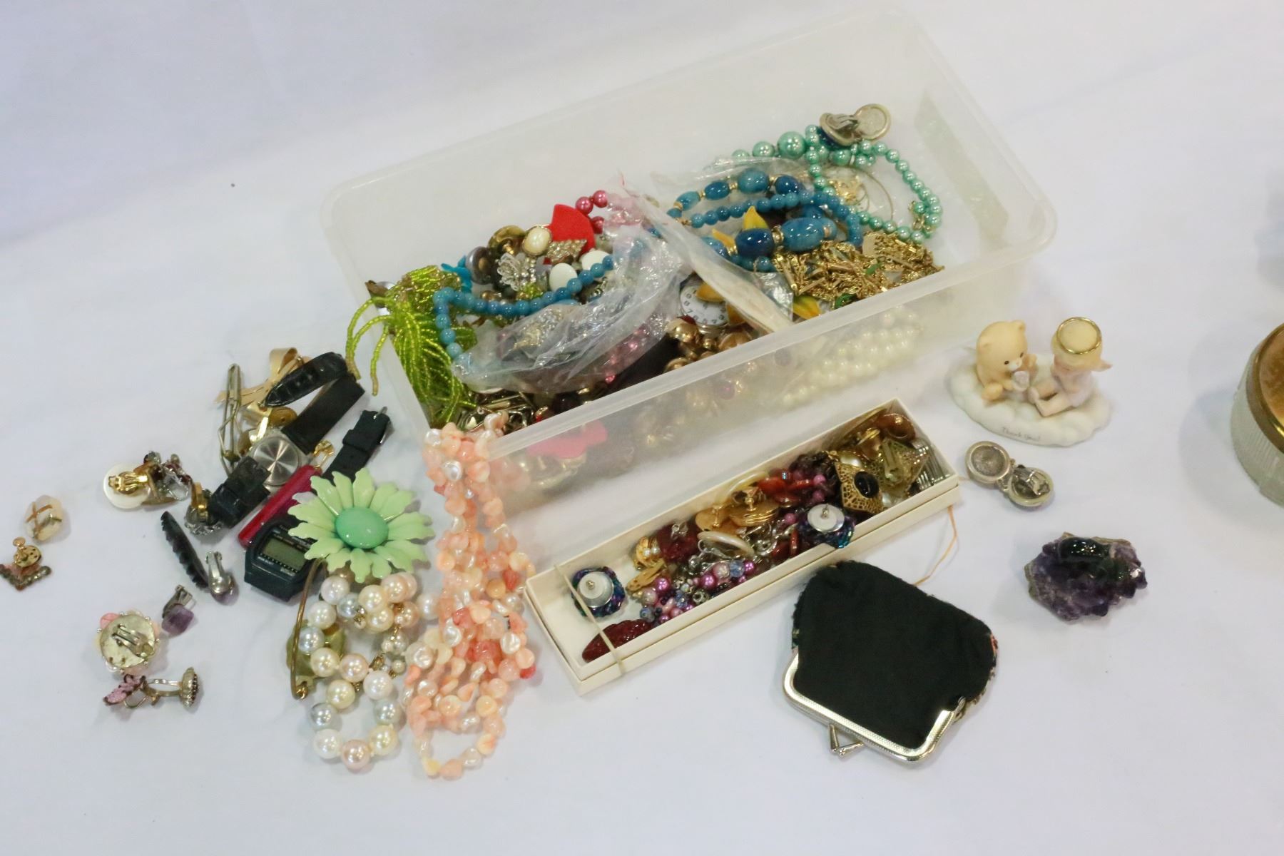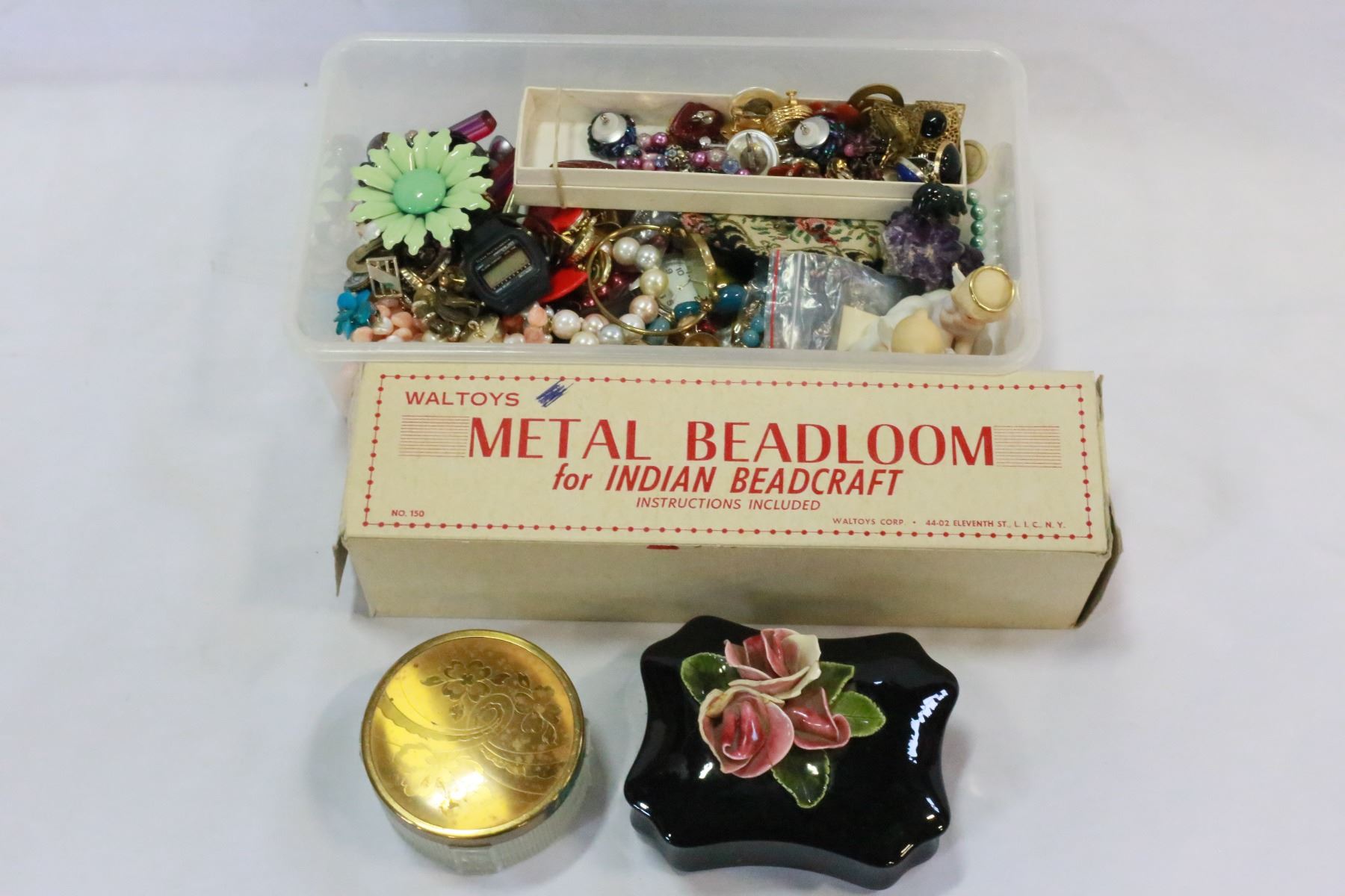 LOT JEWLERY + VANITY DISHES ETC + SMALL BEAD LOOM