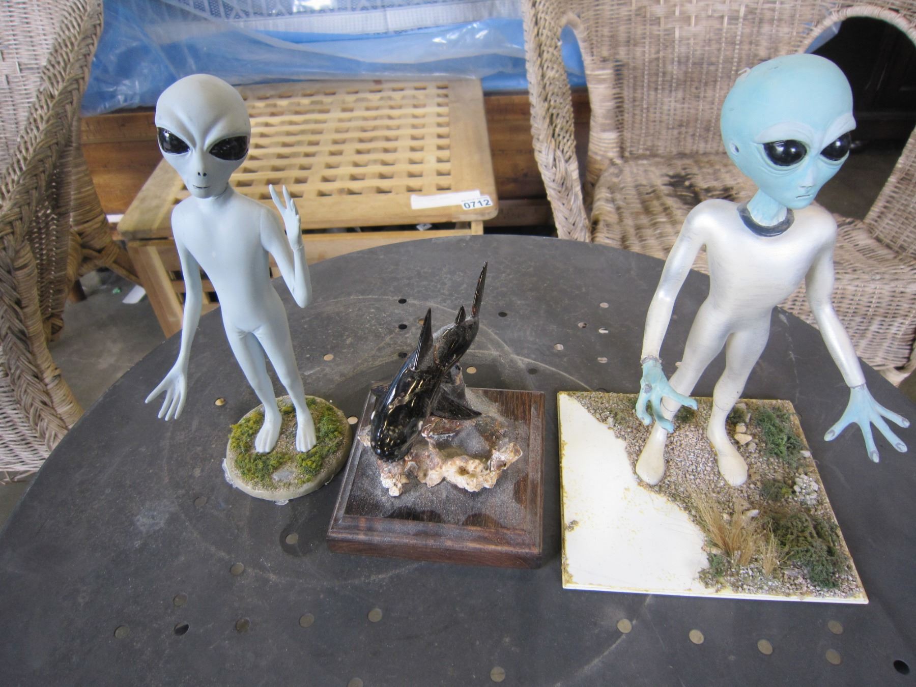 LOT OF 3 FIGURES 2 ALIENS & WOOD SHARK ON ROCK & WOOD