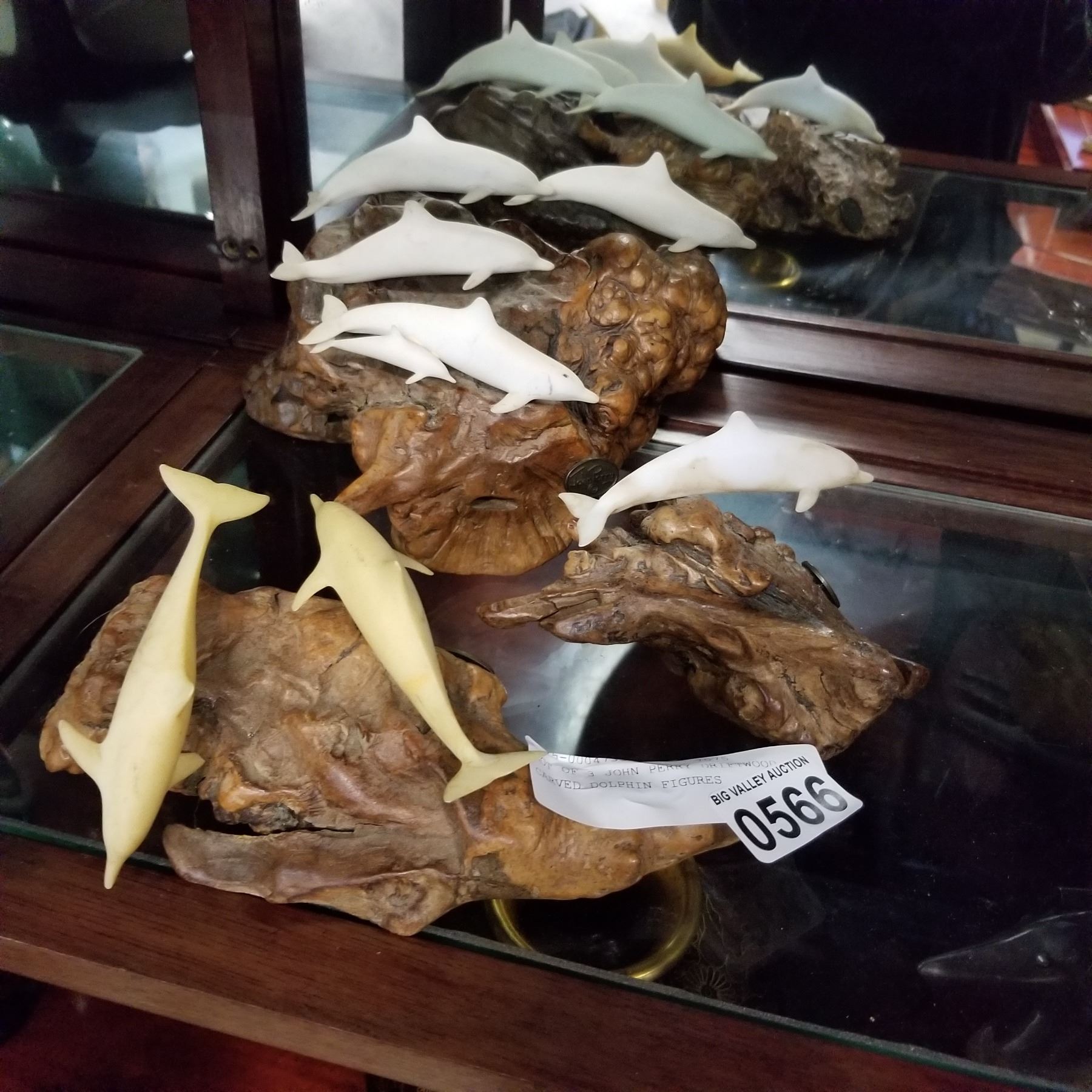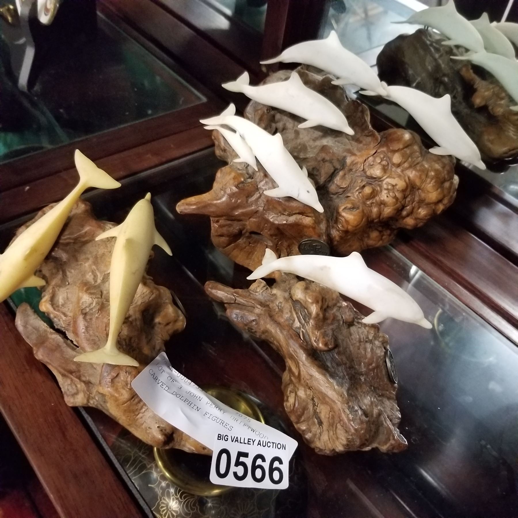 LOT OF 3 JOHN PERRY DRIFTWOOD CARVED DOLPHIN FIGURES