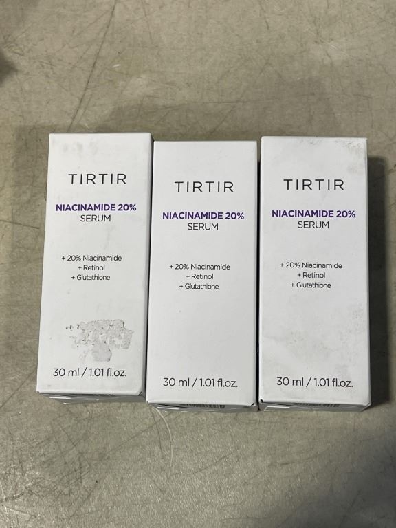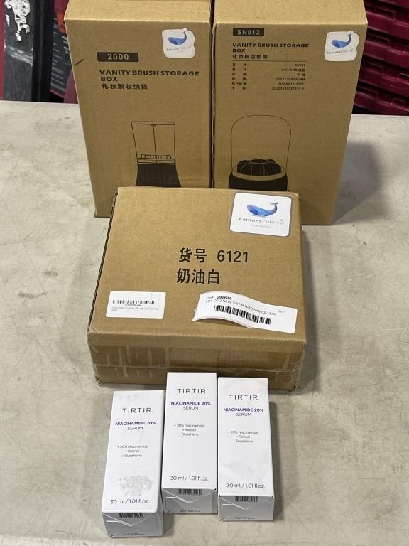 LOT OF 3 NEW TIRTIR NIACINAMIDE 20% SERUM AND FANTASY PALLETE EARRINGS AND RING STORAGE AND 2 ROTATING VANITY BRUSH STORAGE
