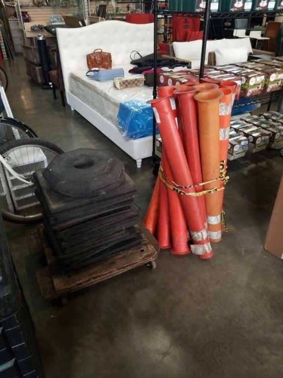 LOT OF 42" PILONS AND HEAVY RUBBER BASES WITH 4 WHEEL DOLLY