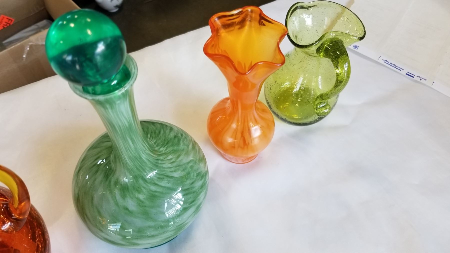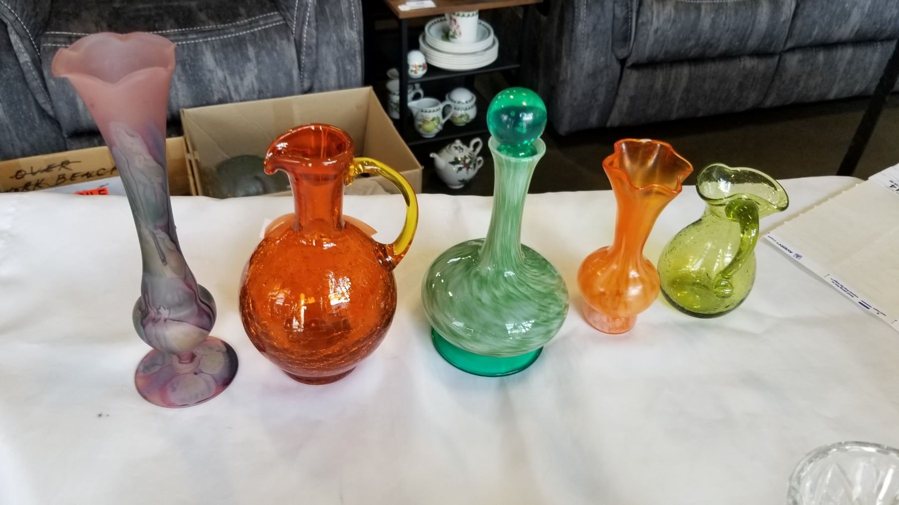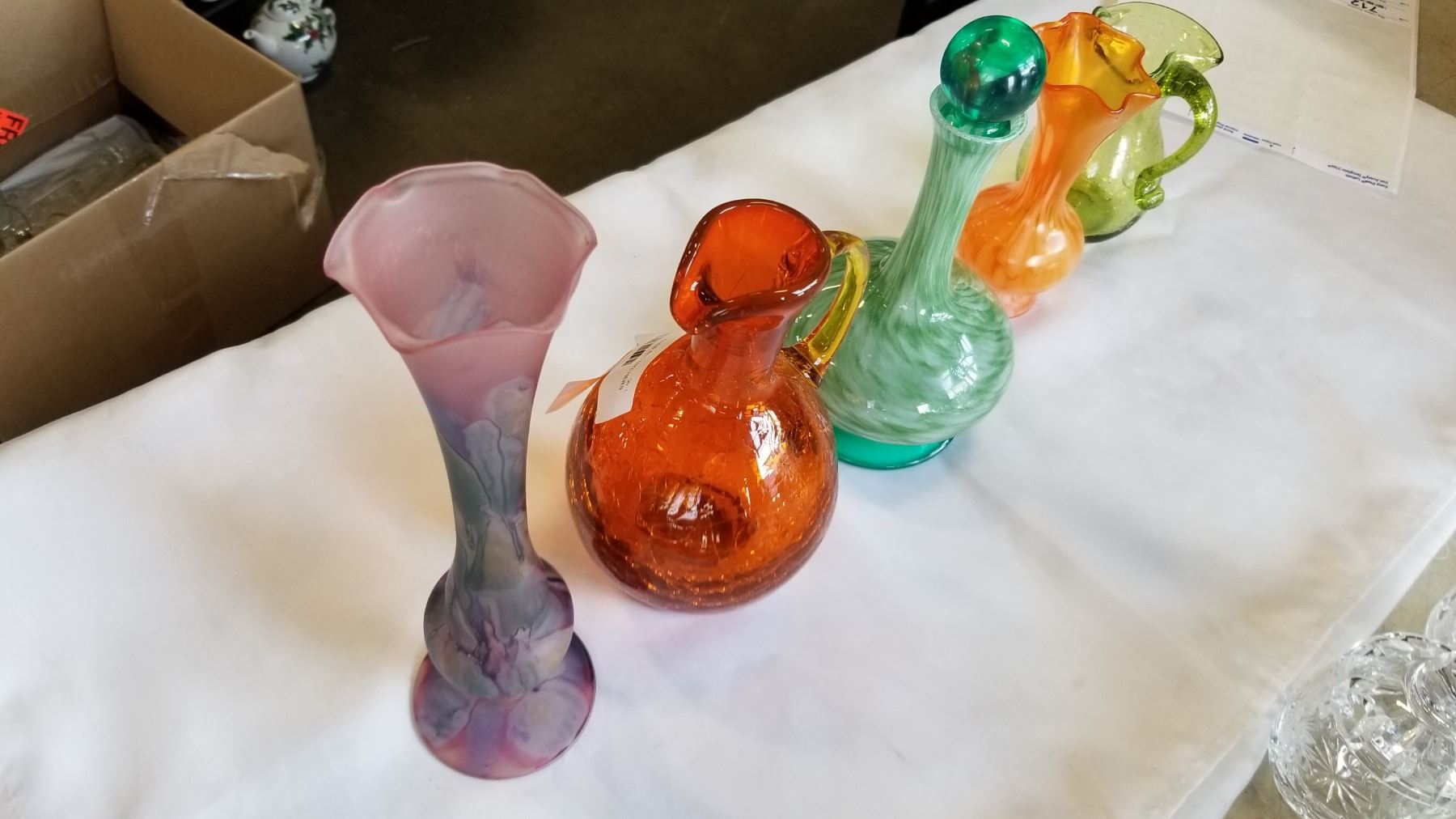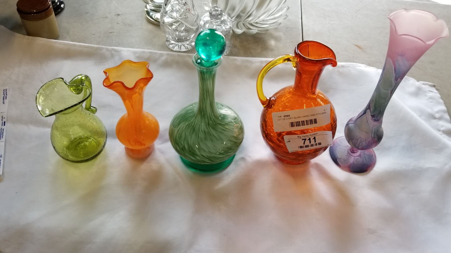 LOT OF 5 ART GLASS VASES AND PITCHERS