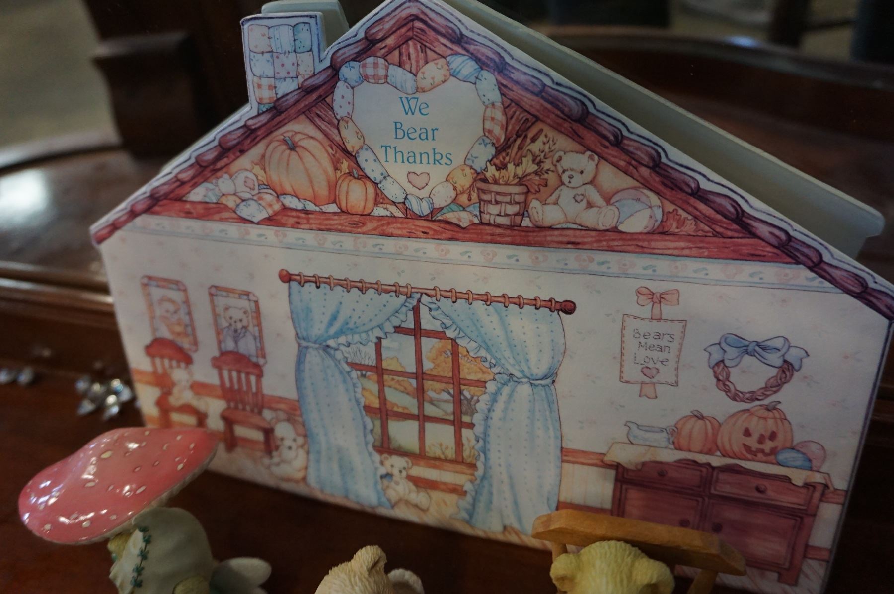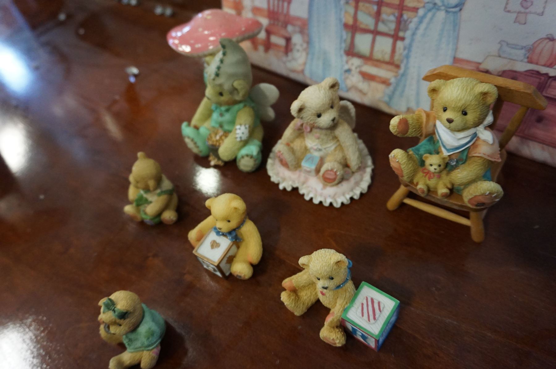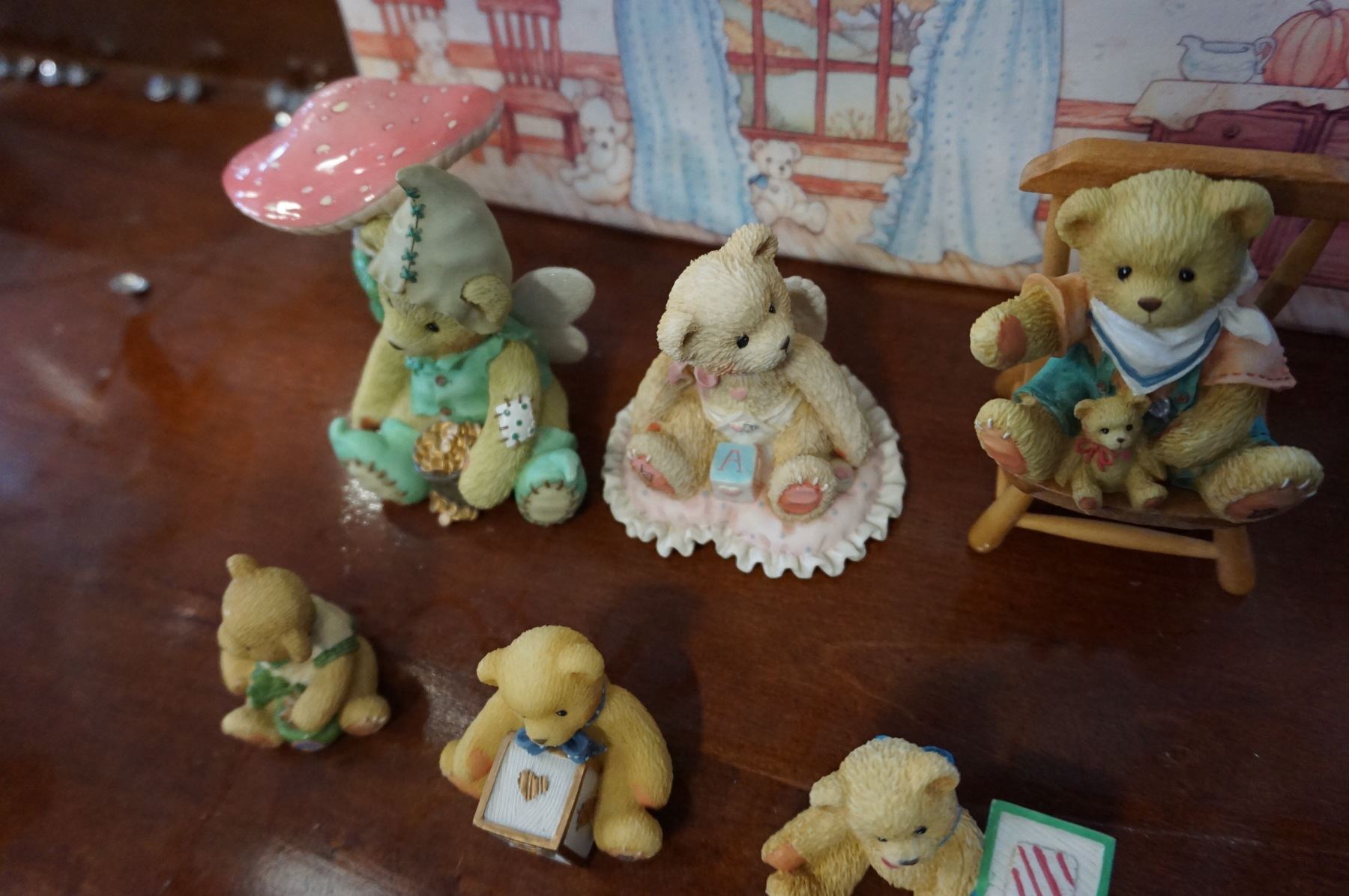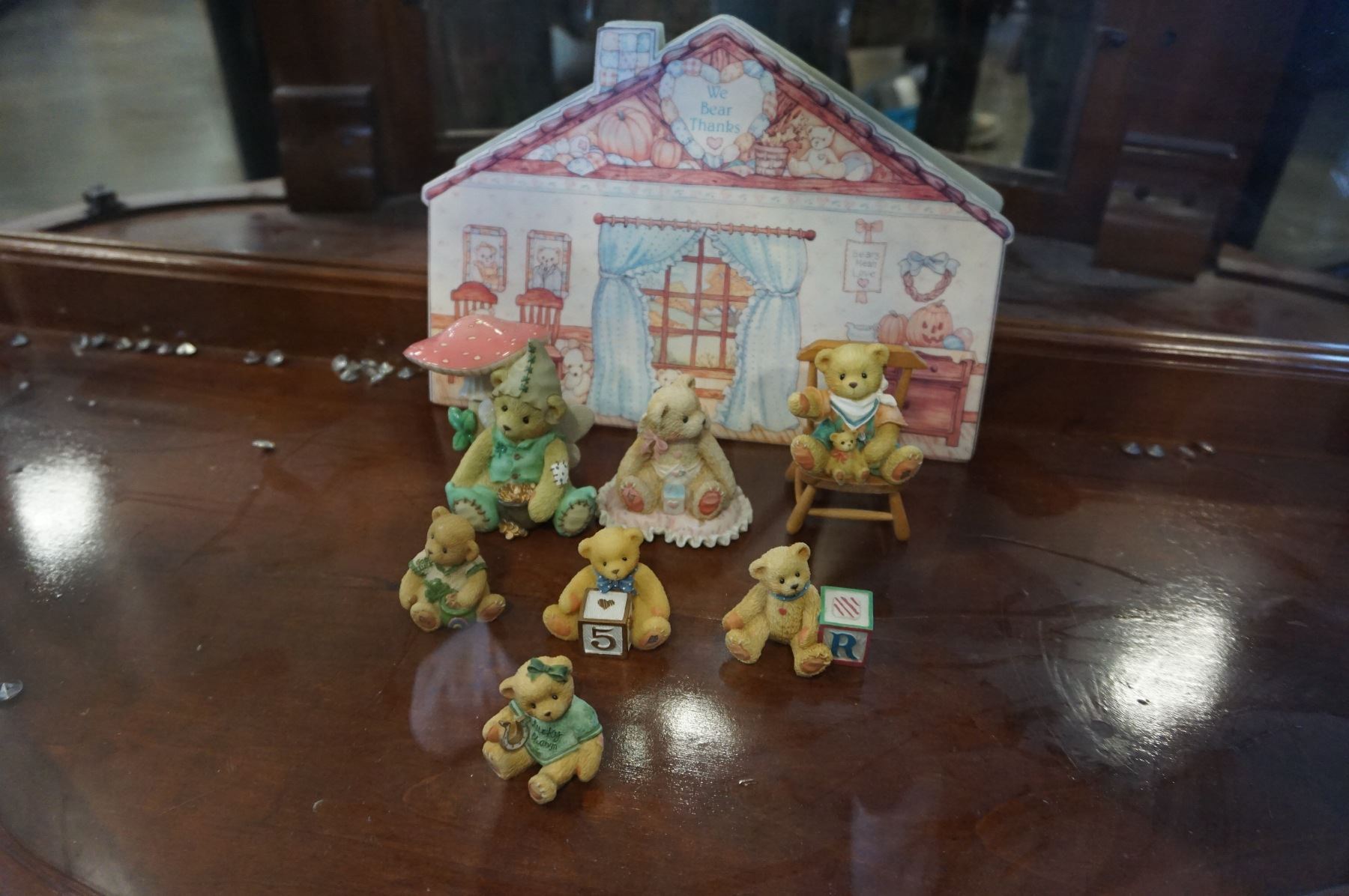 LOT OF 7 CHERISHED TEDDIES FIGURES LUCKY CHARM, FAIRY BEAR, LETTER BEARS AND CARDBOARD HOUSE BACKDRO