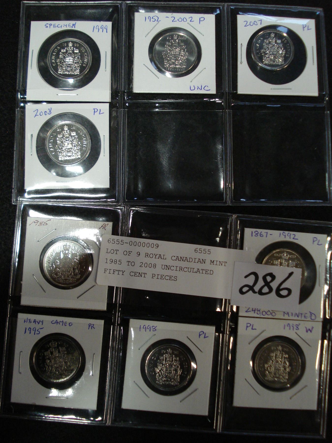 LOT OF 9 ROYAL CANADIAN MINT 1985 TO 2008 UNCIRCULATED FIFTY CENT PIECES