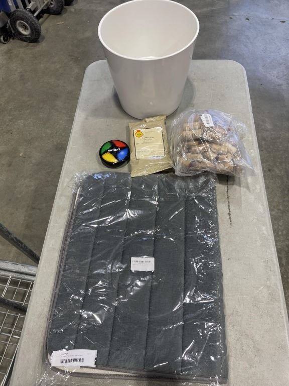 LOT OF AMAZON ITEMS - BATH MAT, GARBAGE CAN, WINE CORKS, ETC