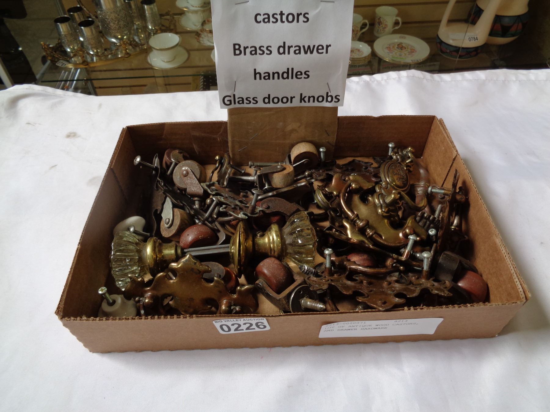 LOT OF ANTIQUE WOOD CASTORS, AND DRAWER HARDWARE